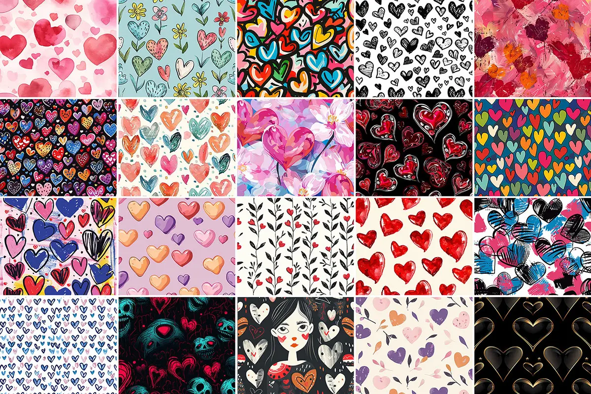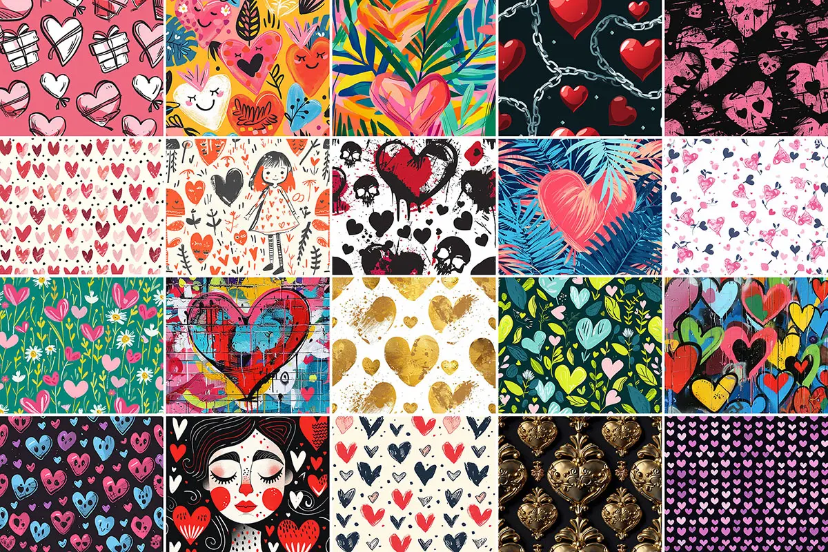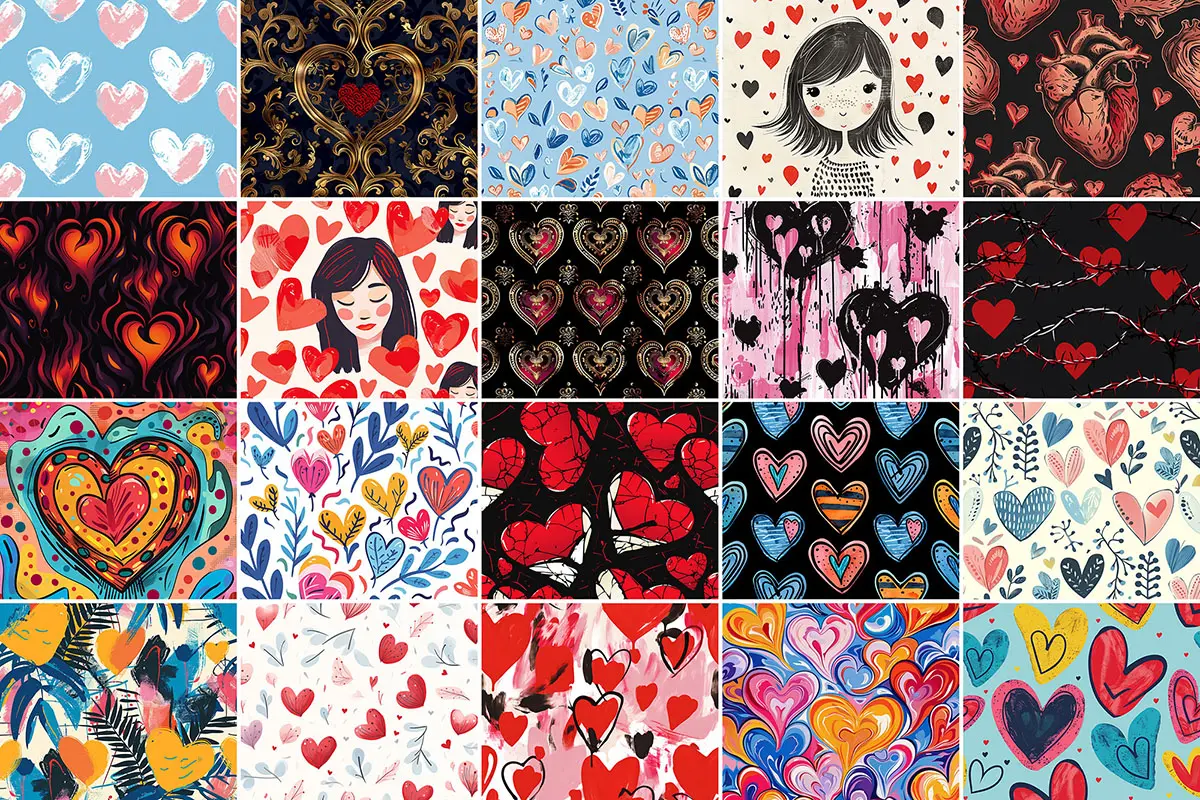 1000+ Heart Patterns 1000款创意潮流手绘情人节心形爱心插画无缝拼接图案背景图片素材