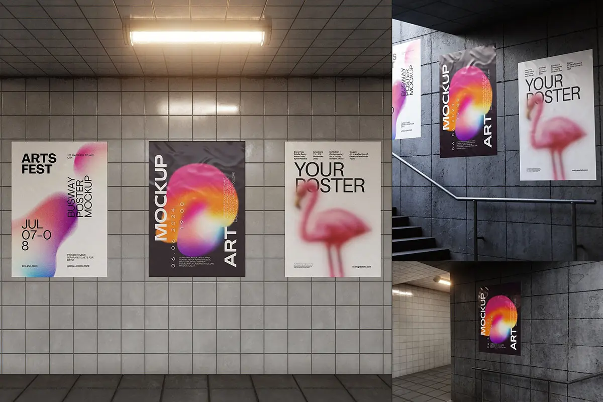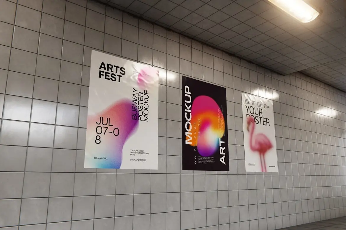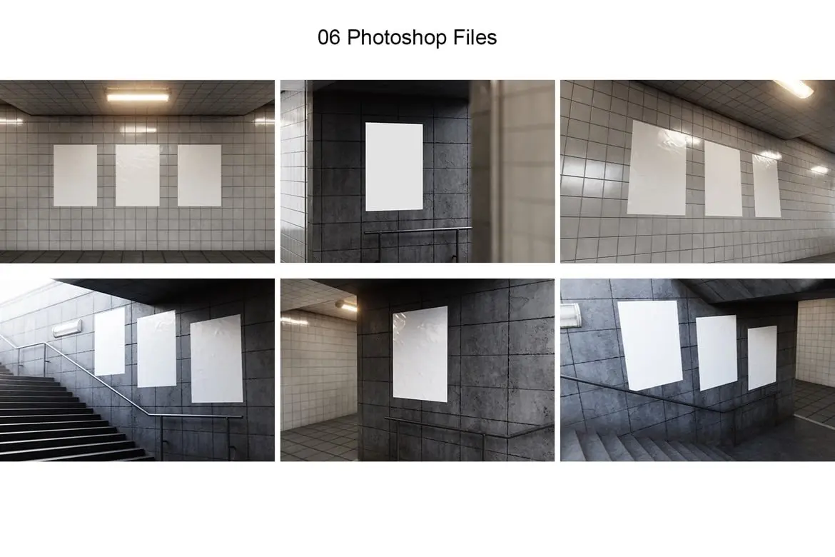 Busway Glued Poster Mockup 6款地下通道墙面褶皱胶合海报广告模型展示设计贴图ps样机素材