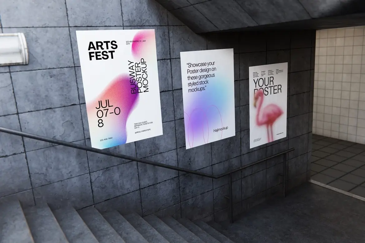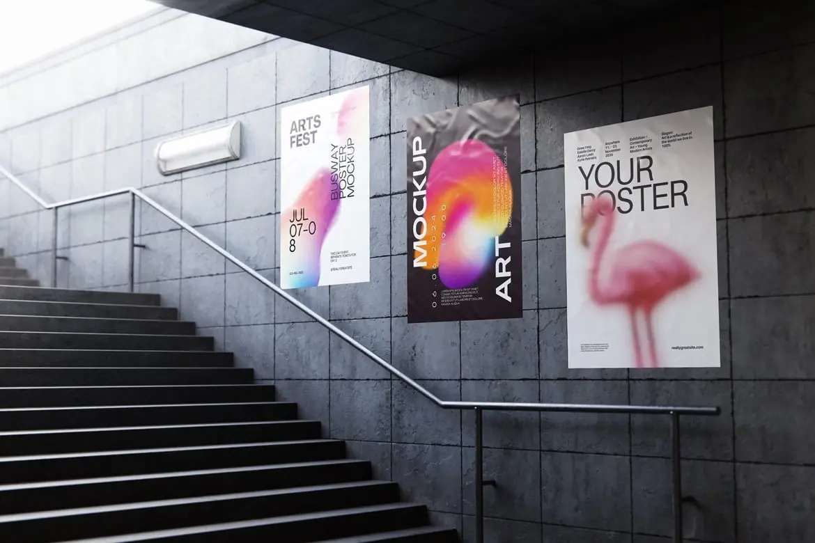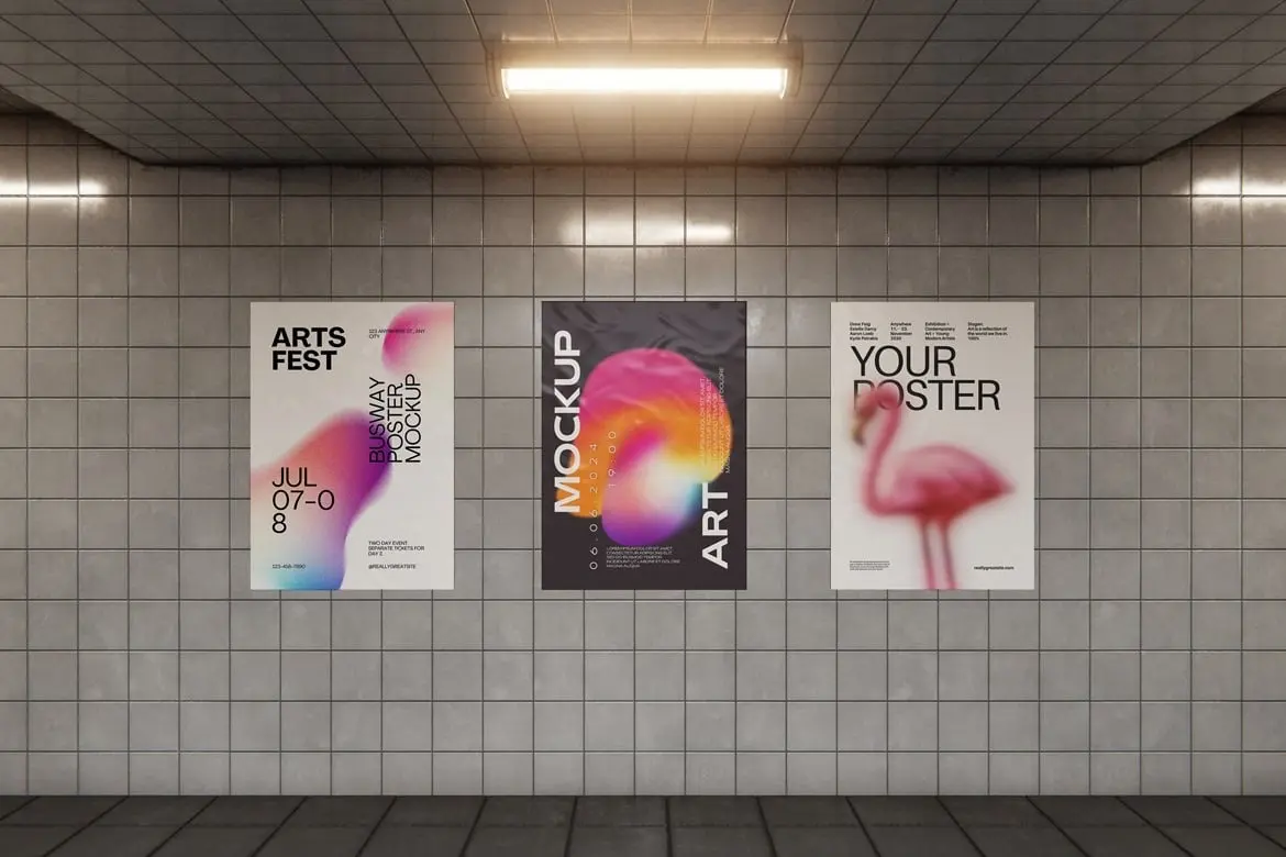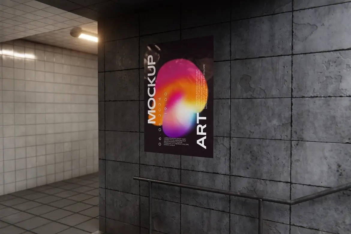 Busway Glued Poster Mockup 6款地下通道墙面褶皱胶合海报广告模型展示设计贴图ps样机素材