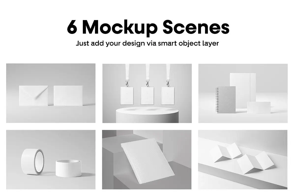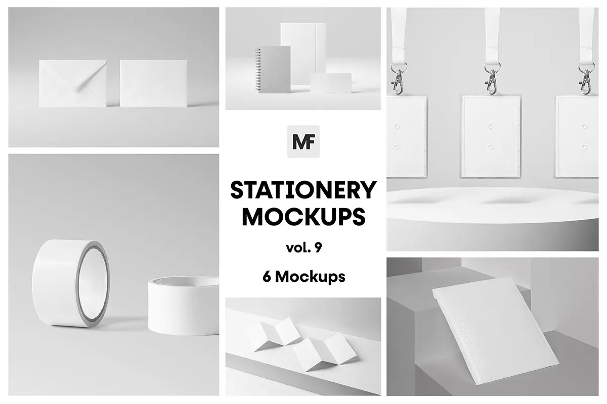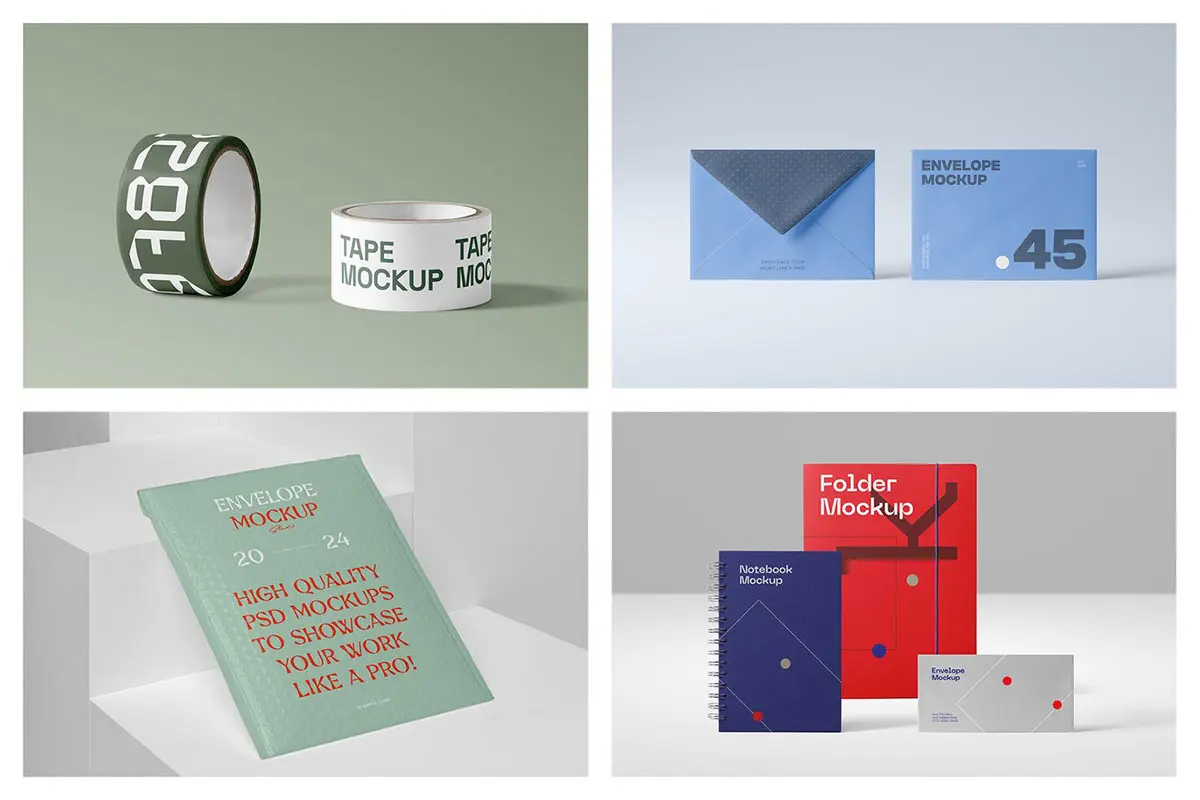 Stationery Products Mockups vol.9 吊牌信封笔记簿胶带卷三折页文具模型品牌展示logo标识设计贴图ps样机素材