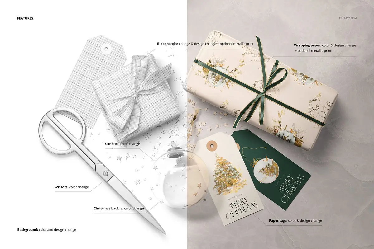 Christmas Wrapped Gifts Mockup 圣诞节新年礼物盒礼品纸盒包装纸标签卡片设计ps样机展示效果图