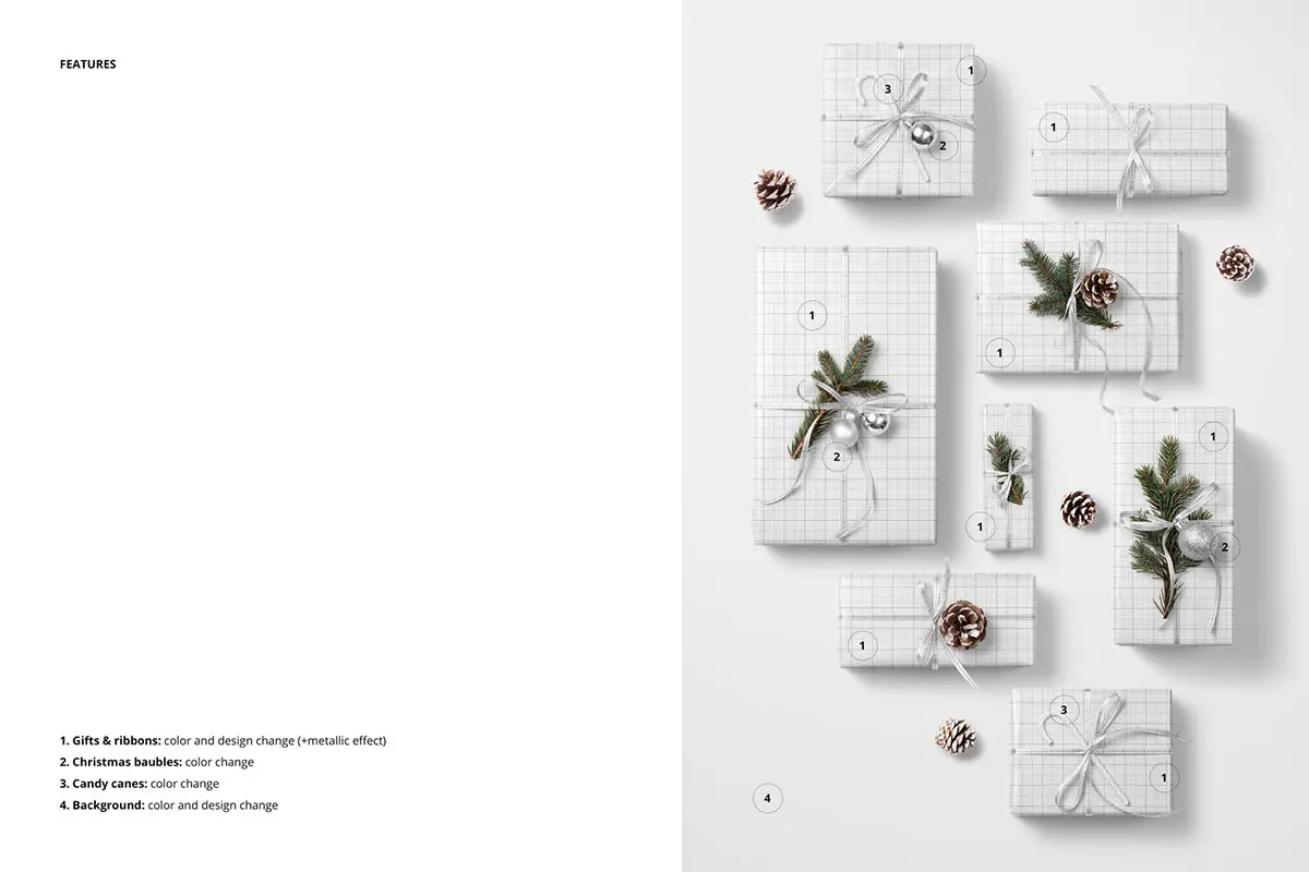 Group of Christmas Gifts Mockup 多规格圣诞节礼物礼品盒纸盒松果装饰包装设计ps样机展示效果图