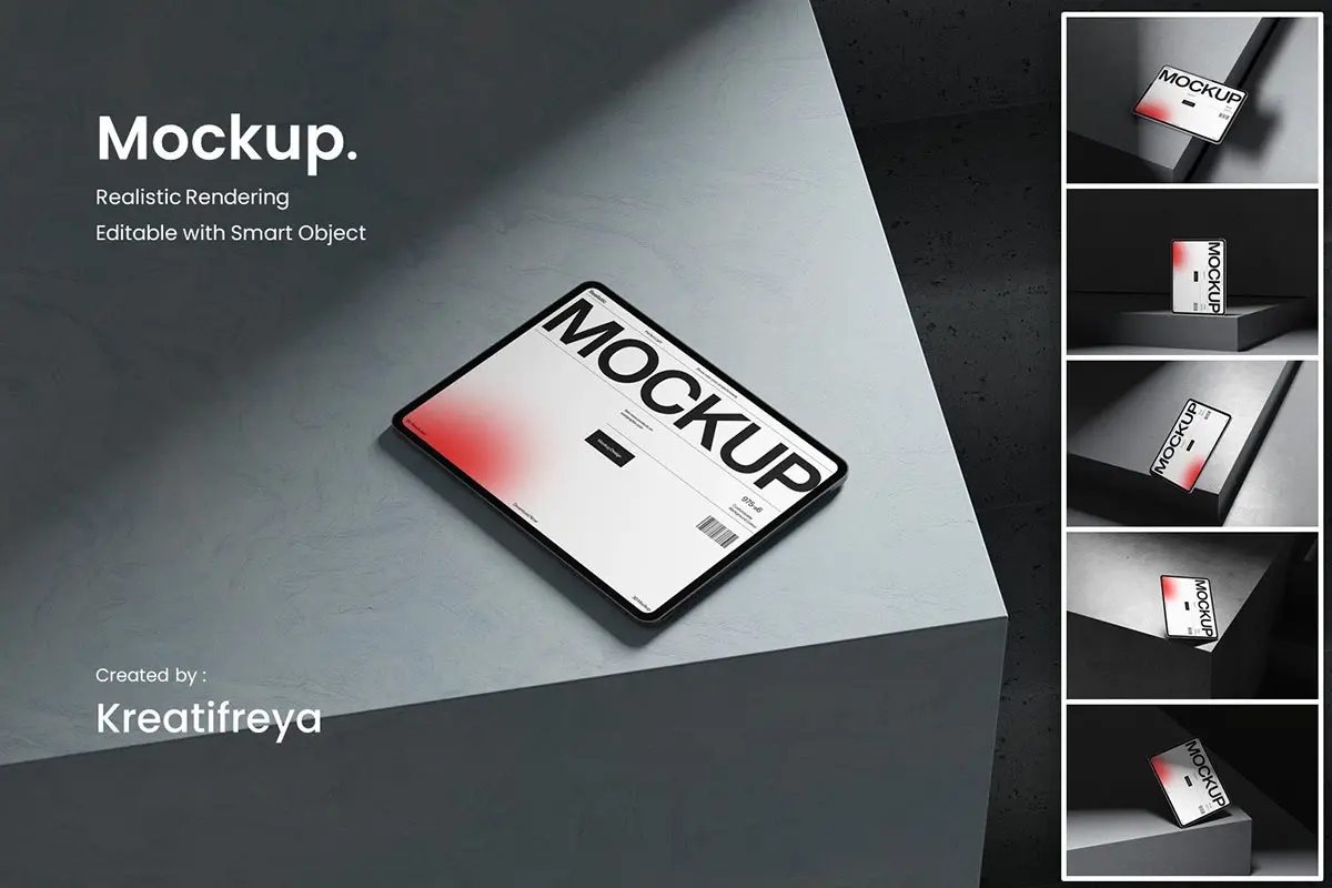 使用此平板电脑模型展示您的数字项目,非常适合展示应用程序、网站和品牌设计。此模板具有逼真的灯光和阴影效果,可提供专业且可自定义的演示,以有效突出您的创意作品