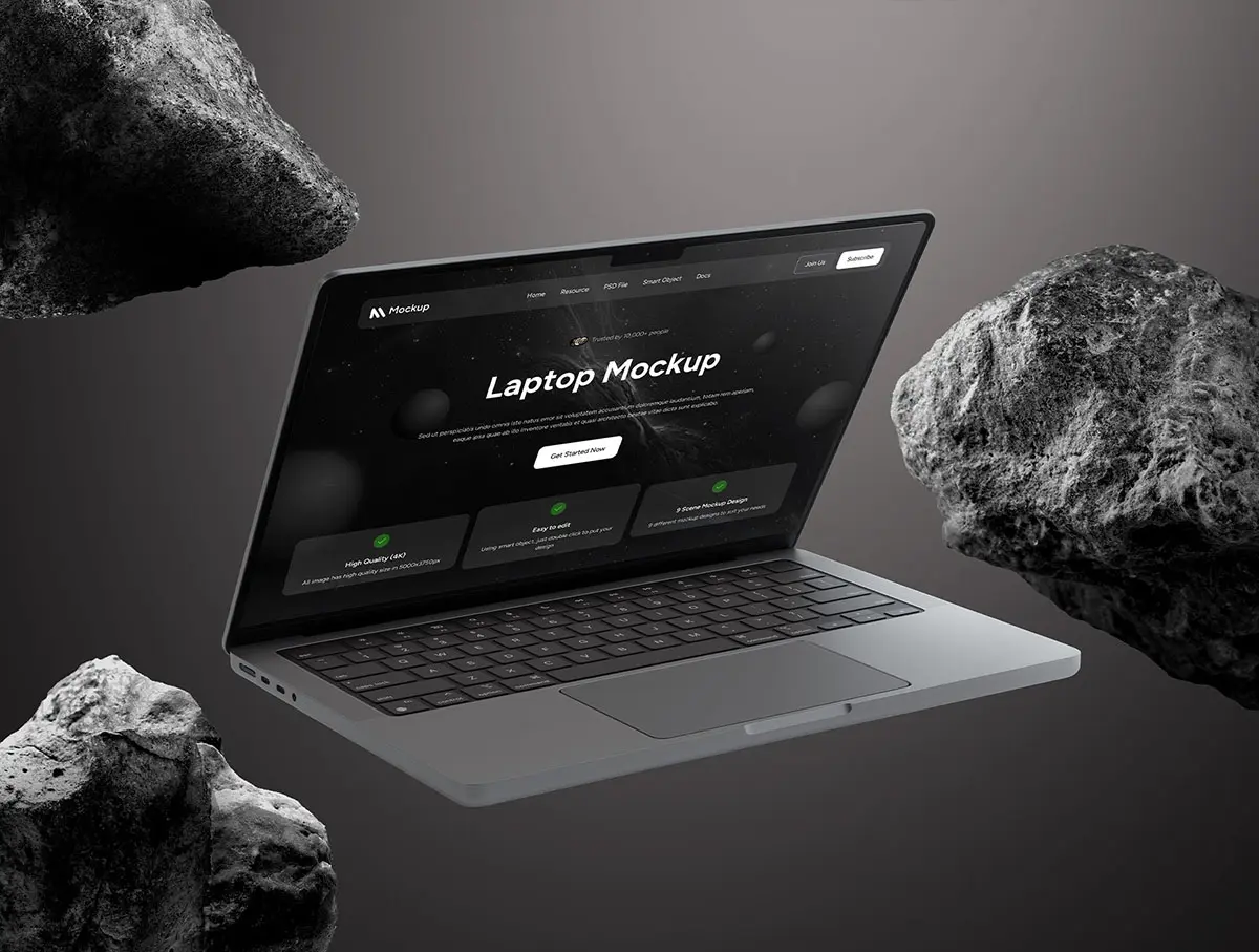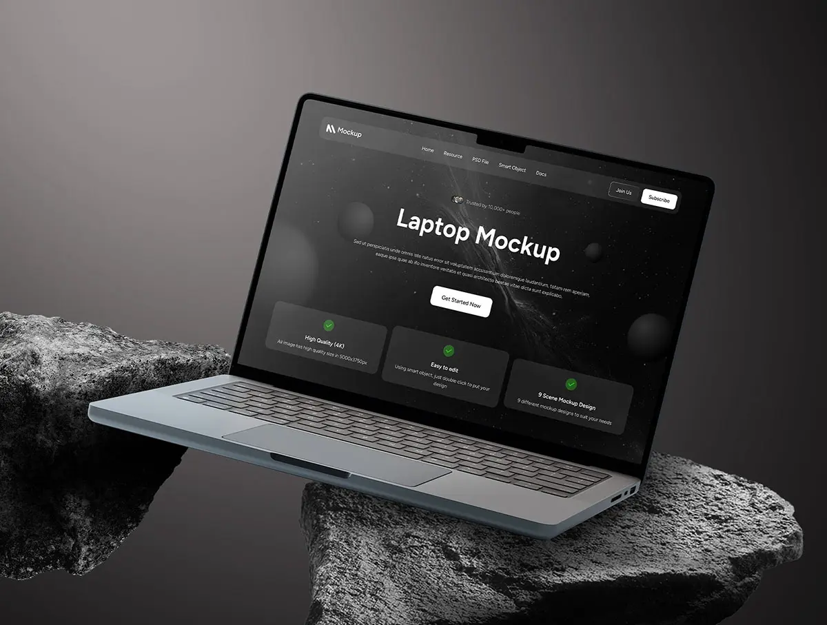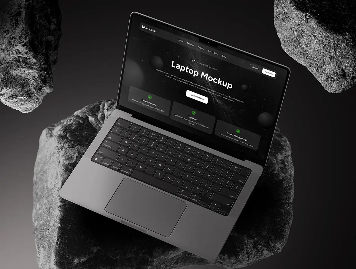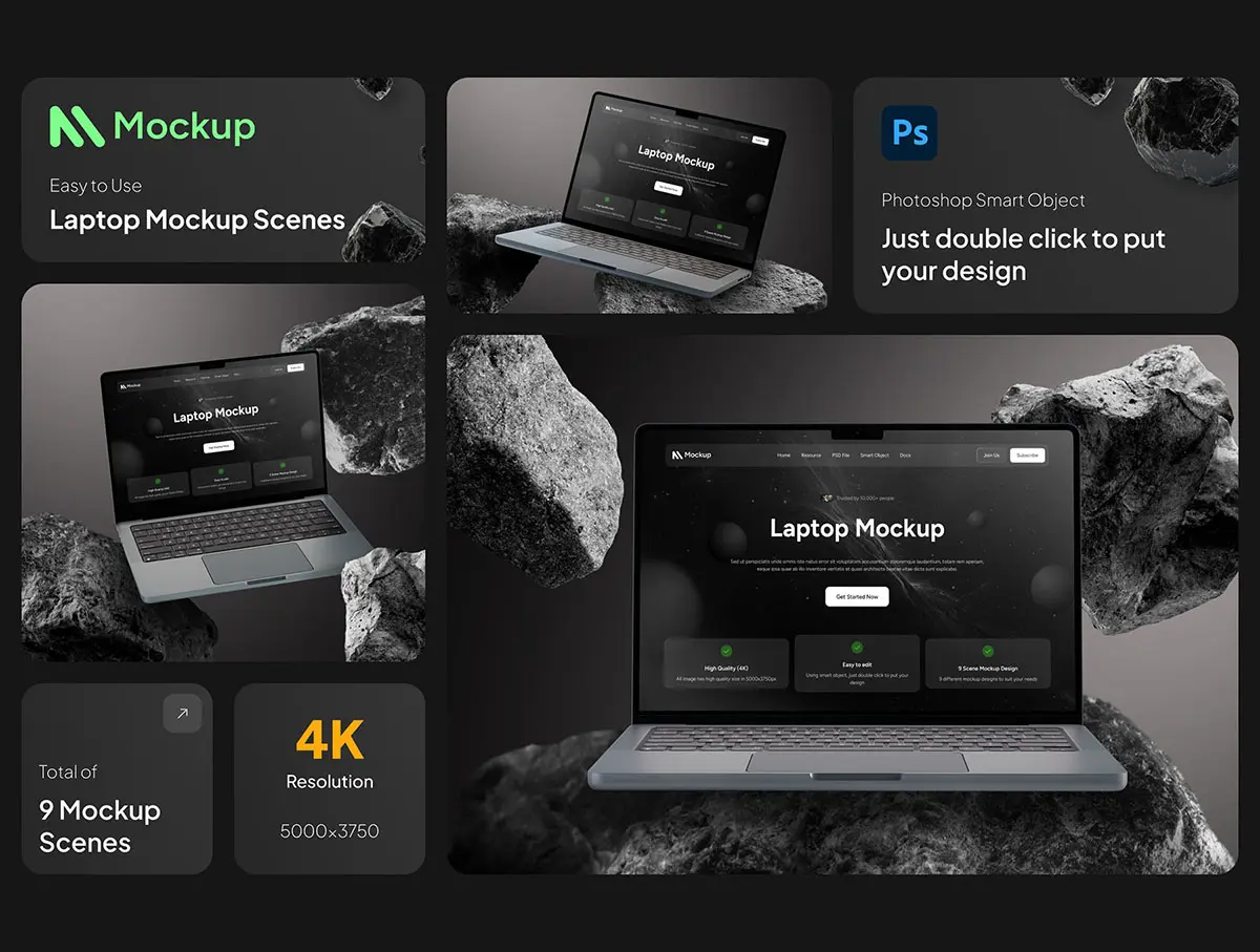 Laptop Mockup Screen Collection 岩石背景苹果电脑笔记本屏幕ui作品展示设计贴图ps样机素材