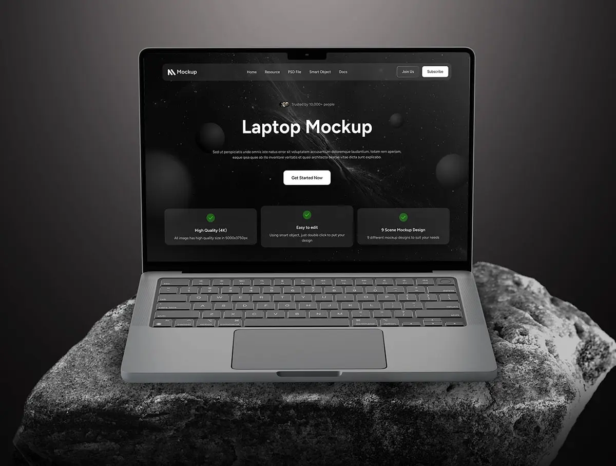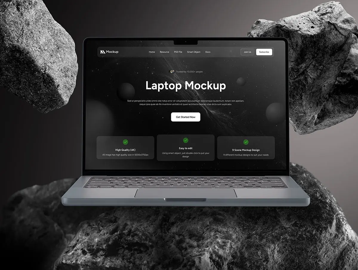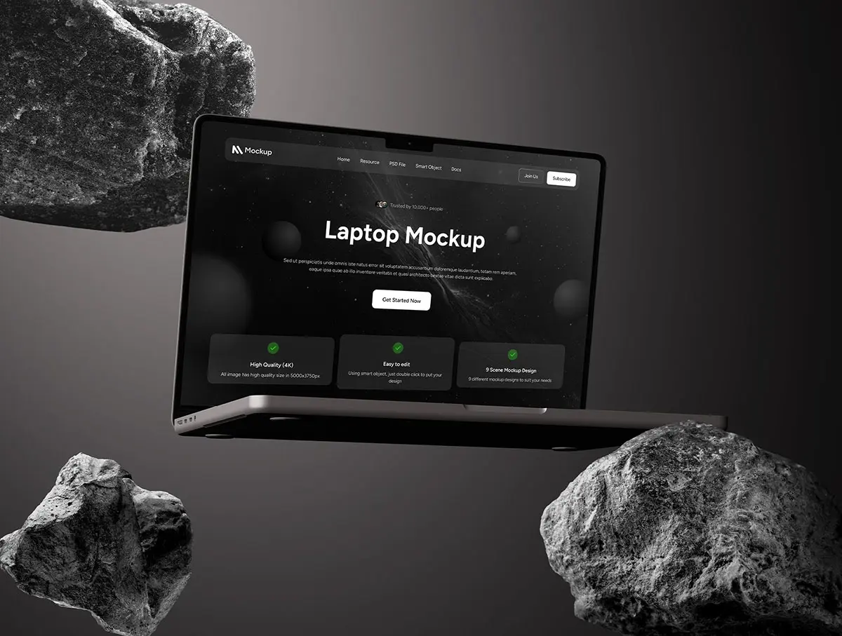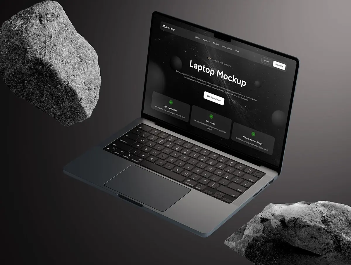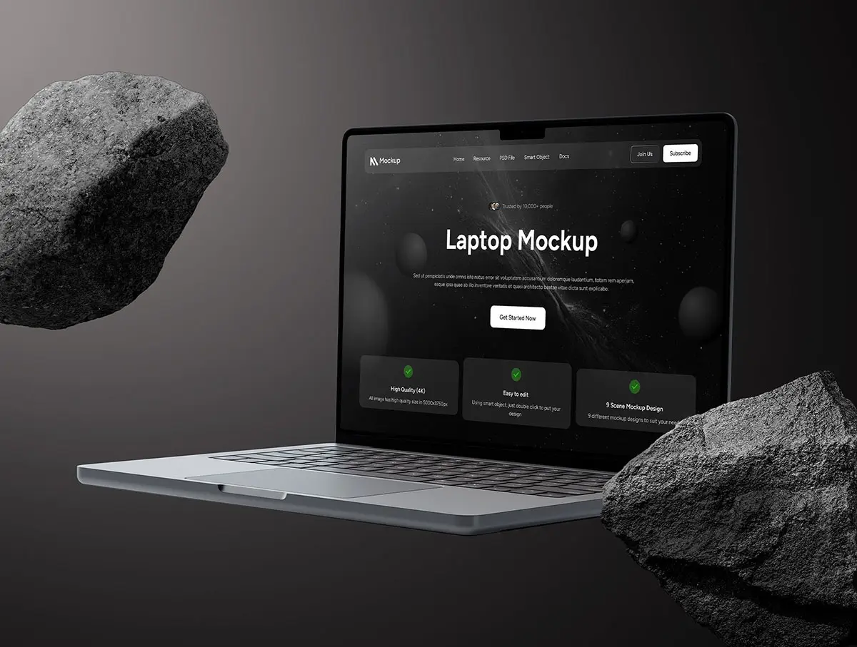Laptop Mockup Screen Collection 岩石背景苹果电脑笔记本屏幕ui作品展示设计贴图ps样机素材