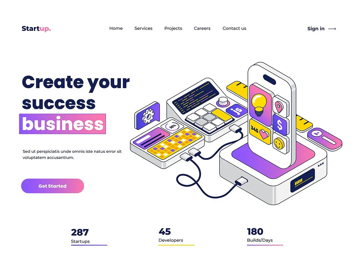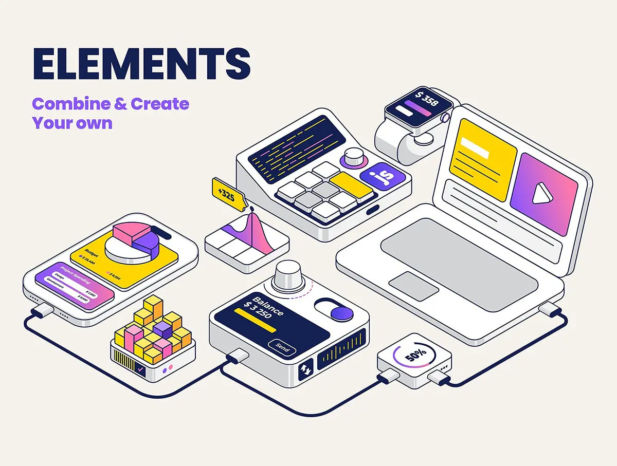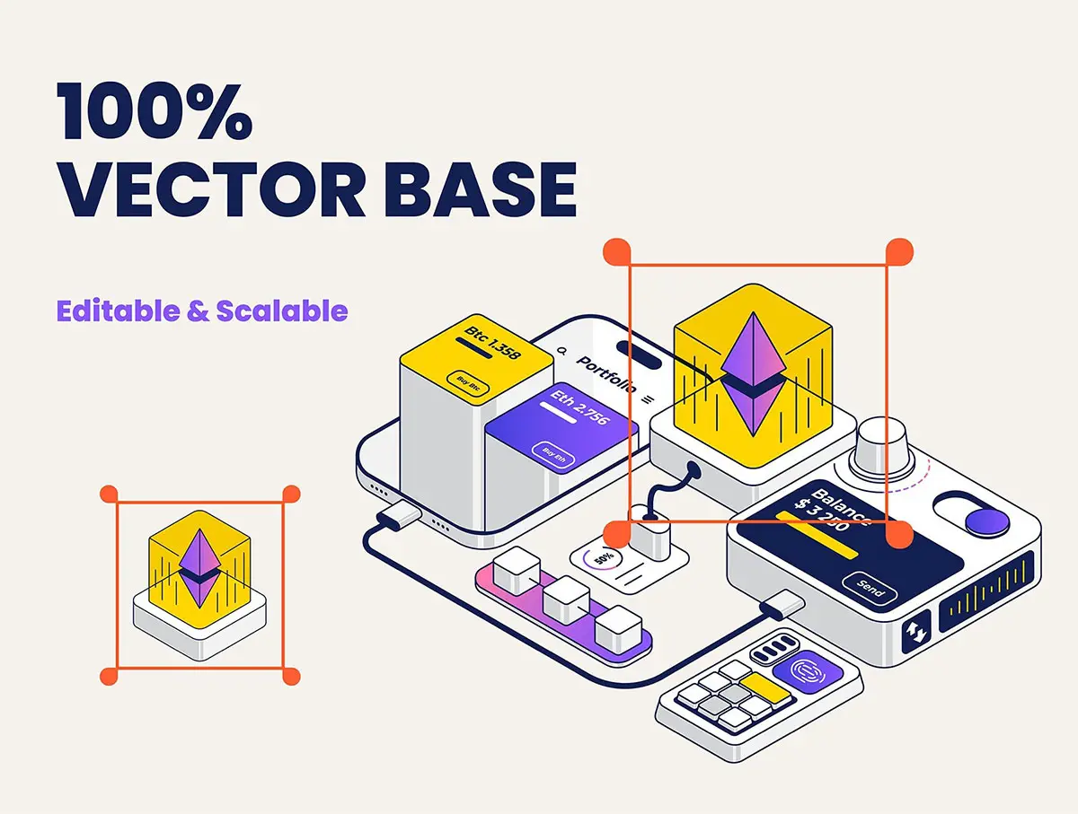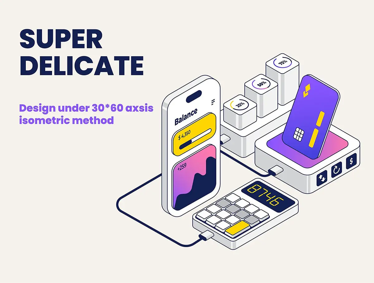 这是数字业务等距插图集的包。您可以将这些插图作为静态图像添加到您的产品中,也可以将它们转换为 SVG 动画,因为它们的层次分明、组织有序,并且准备好了 css 运动属性。插图采用 30 度和 60 度轴等距方法精心设计。您可以根据需要组合资产,此文件非常易于使用。