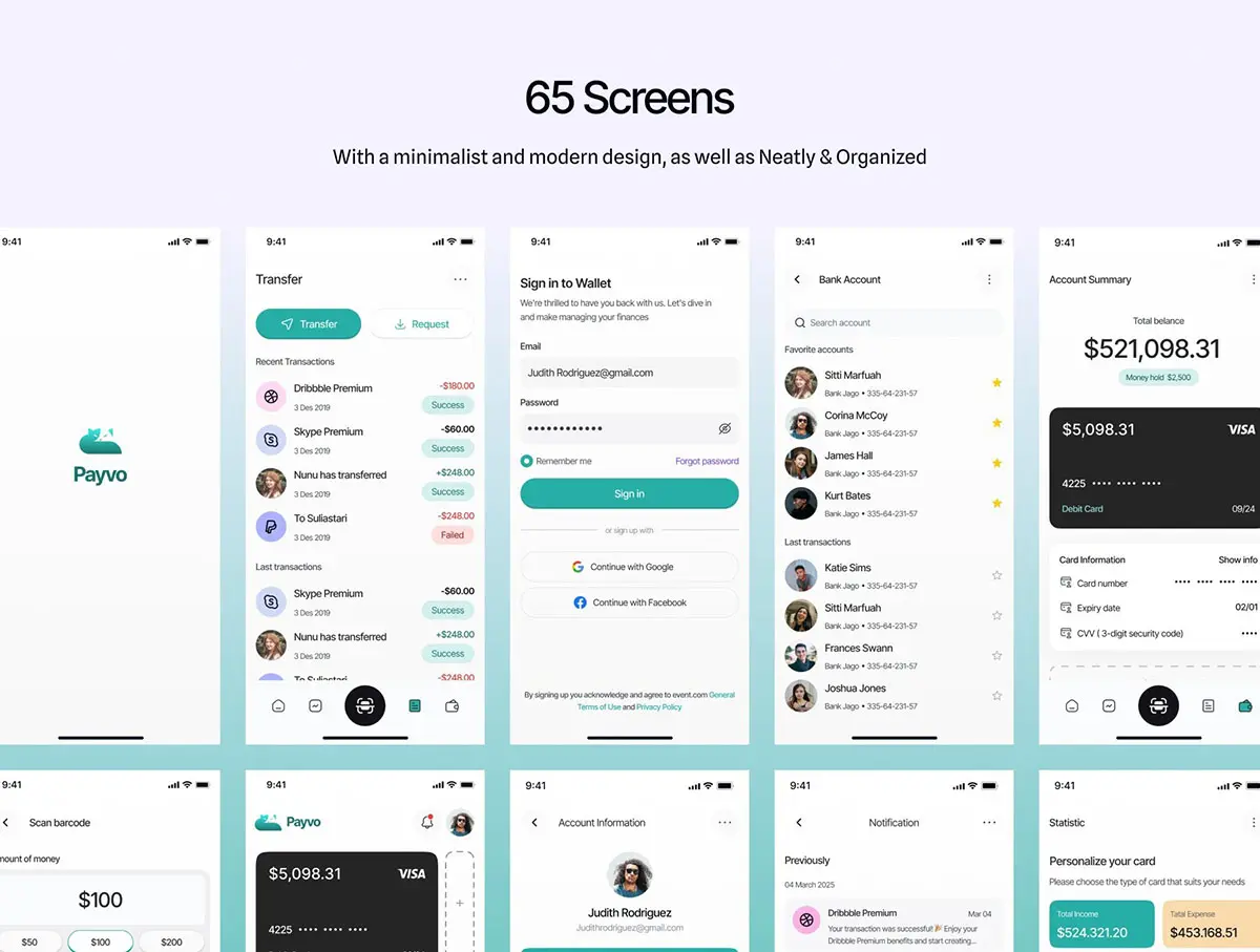 Payvo – Mobile Banking App 65+屏手机银行应用程序金融理财管理用户界面app设计UI套件