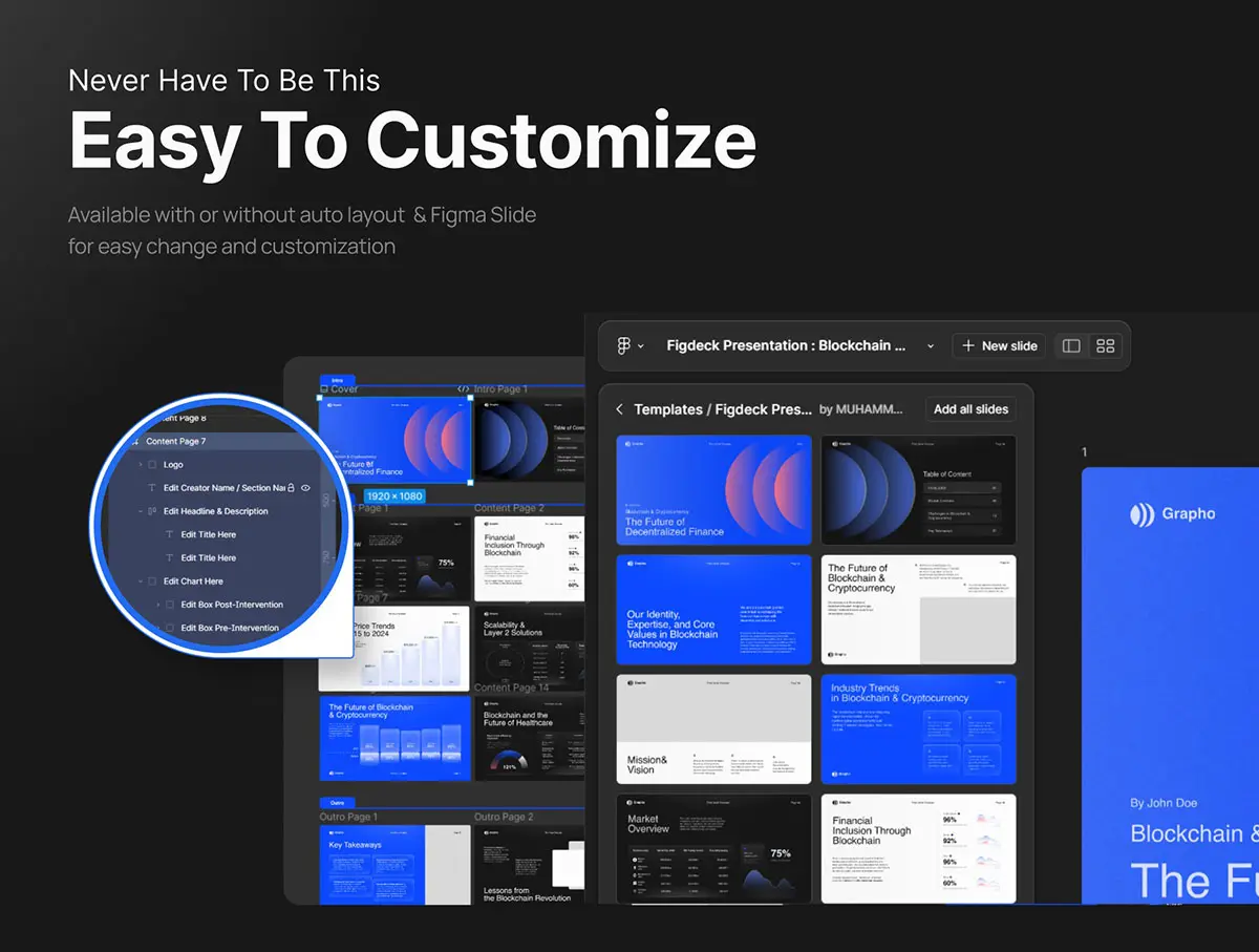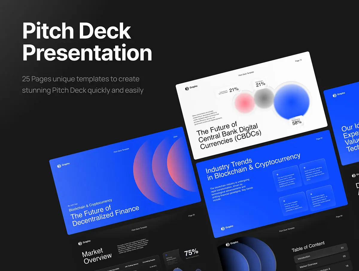 Grapho – 区块链和加密货币 Pitch Deck 是使用 Figma 制作的大师级演示文稿,具有时尚简约的风格,您可以使用品牌颜色进行自定义,所有内容都包含在动态幻灯片中。