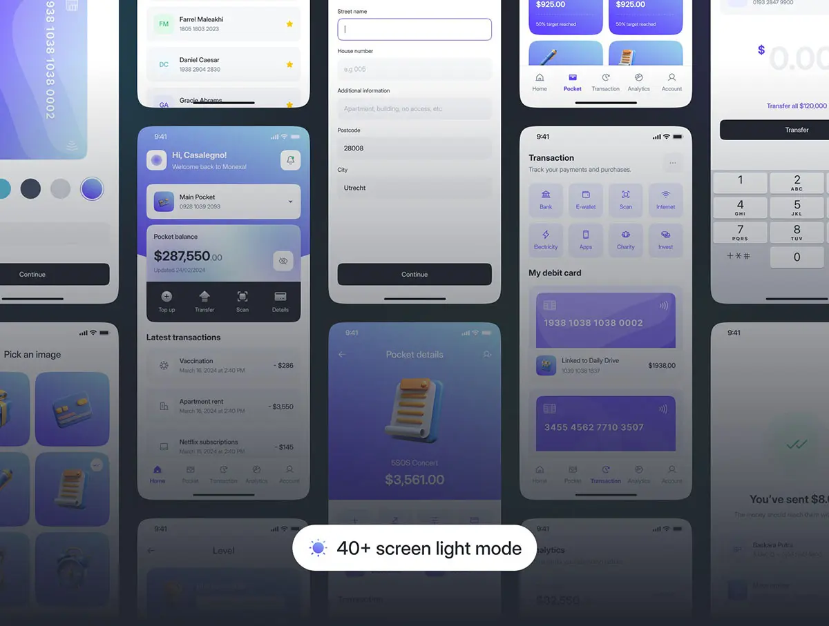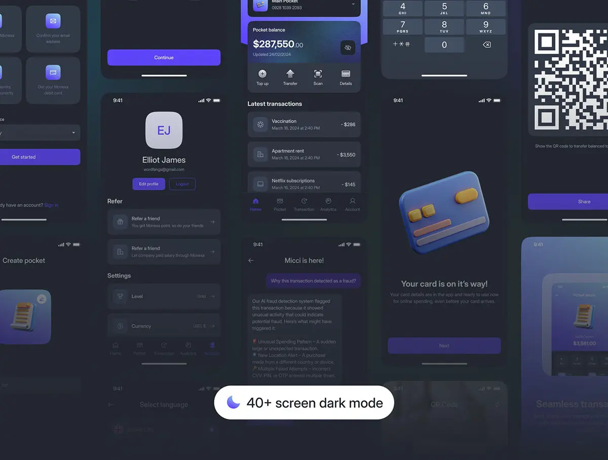 Monexa – Digital Bank App UI KIT 90+屏双配色AI人工智能电子钱包金融财务理财app ui界面设计figma模板套件