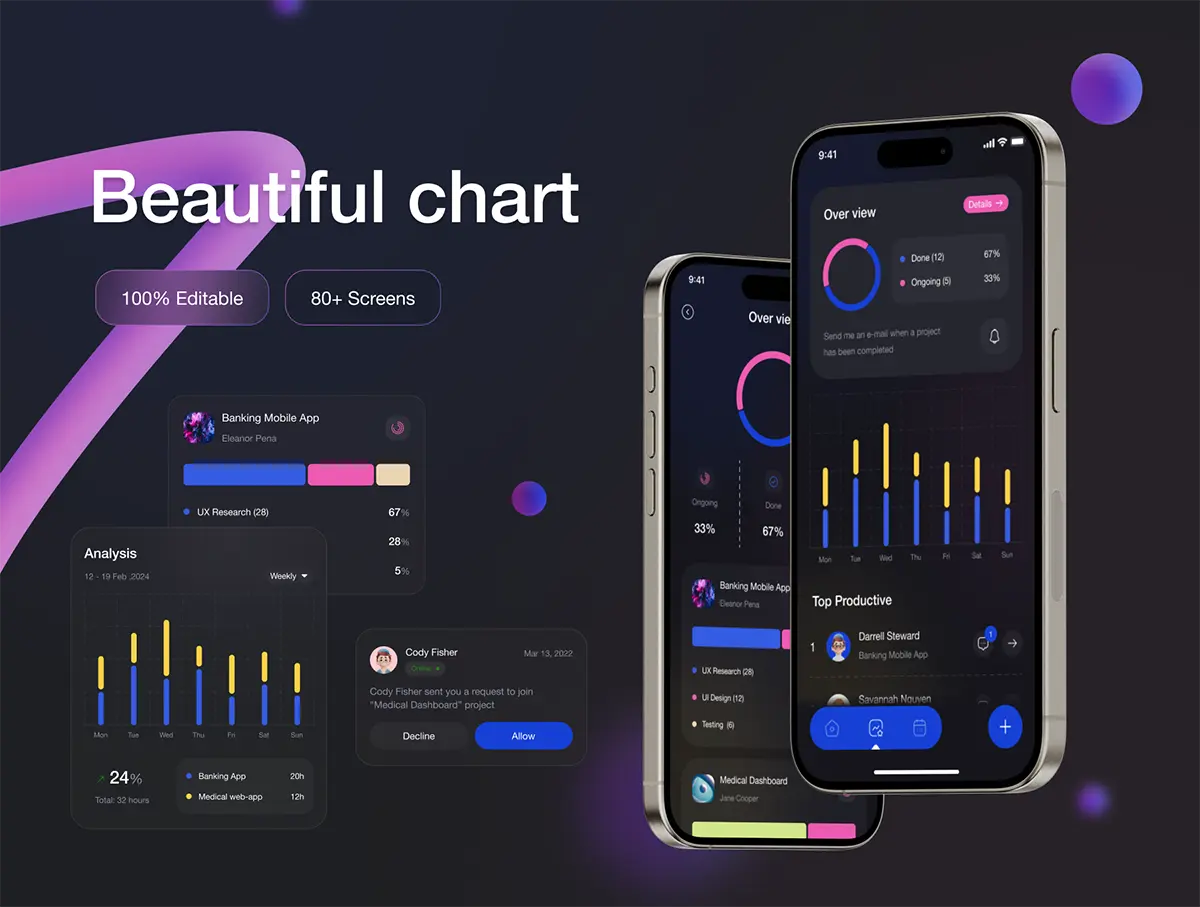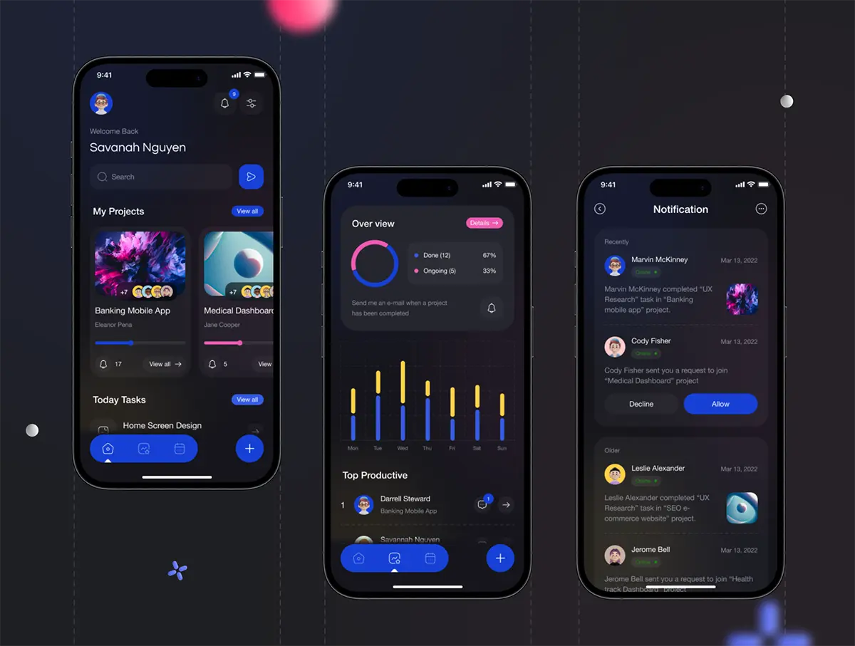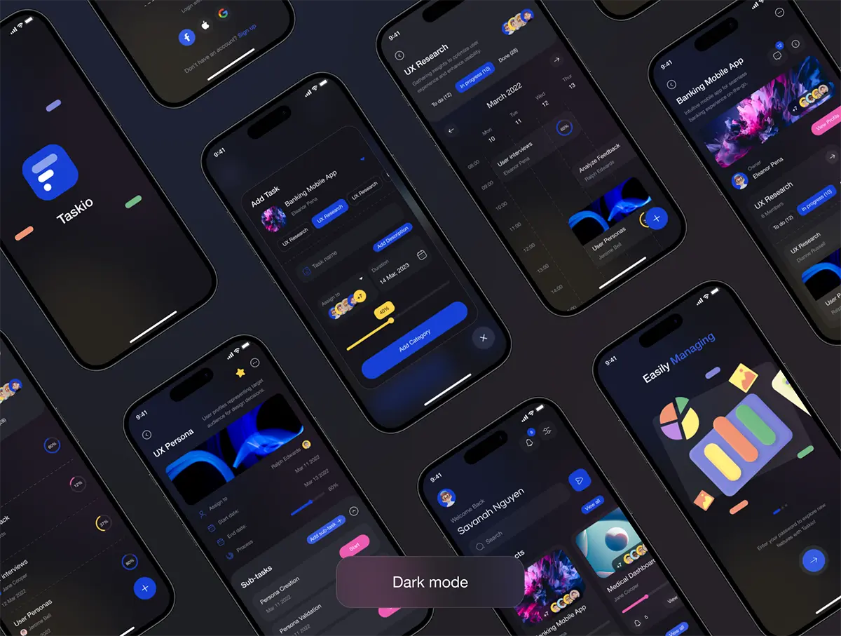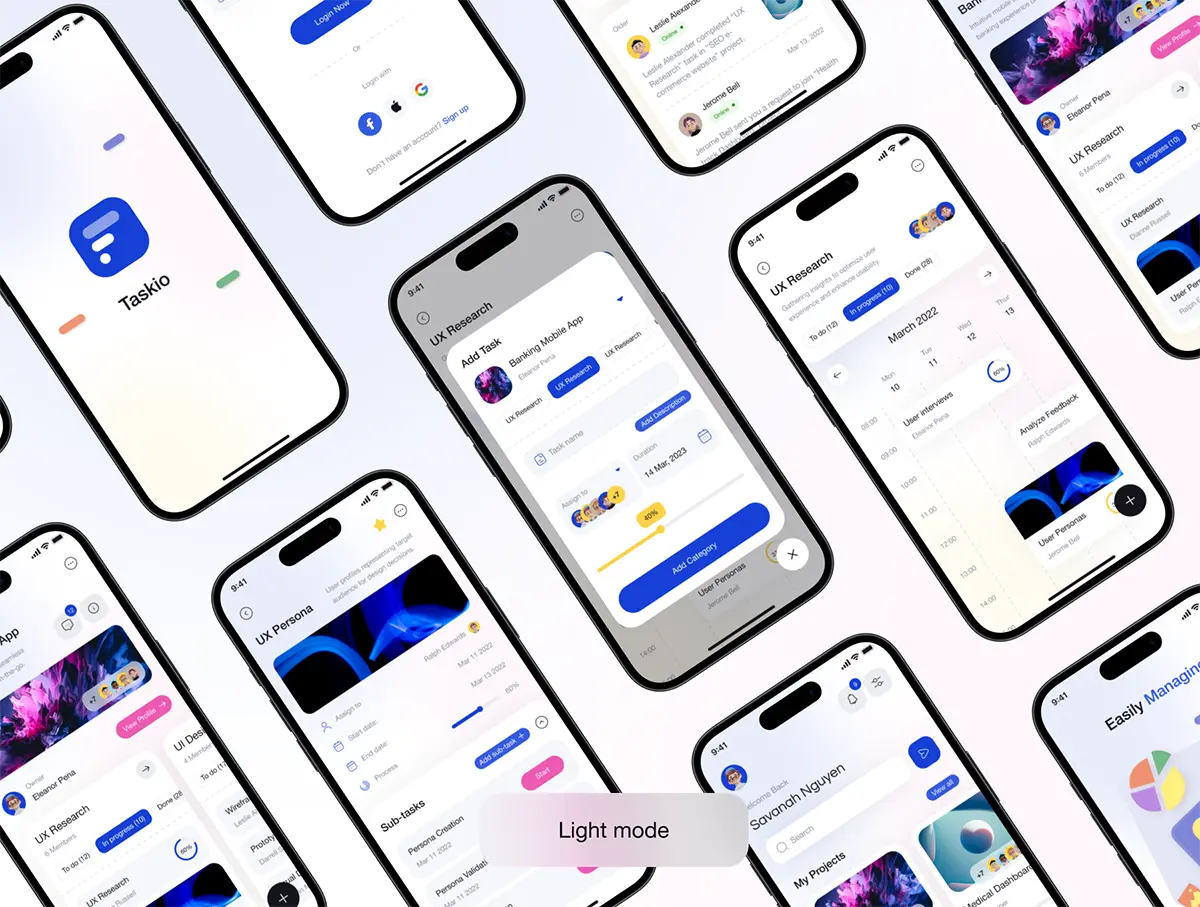 双配色项目管理团队任务协作沟通平台app应用工具ui界面设计模板 Taskio – Project Managemnet Mobile UI Kit