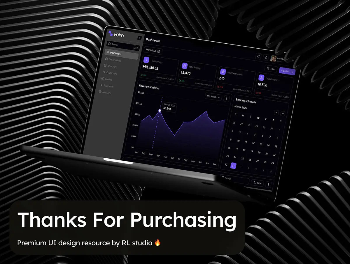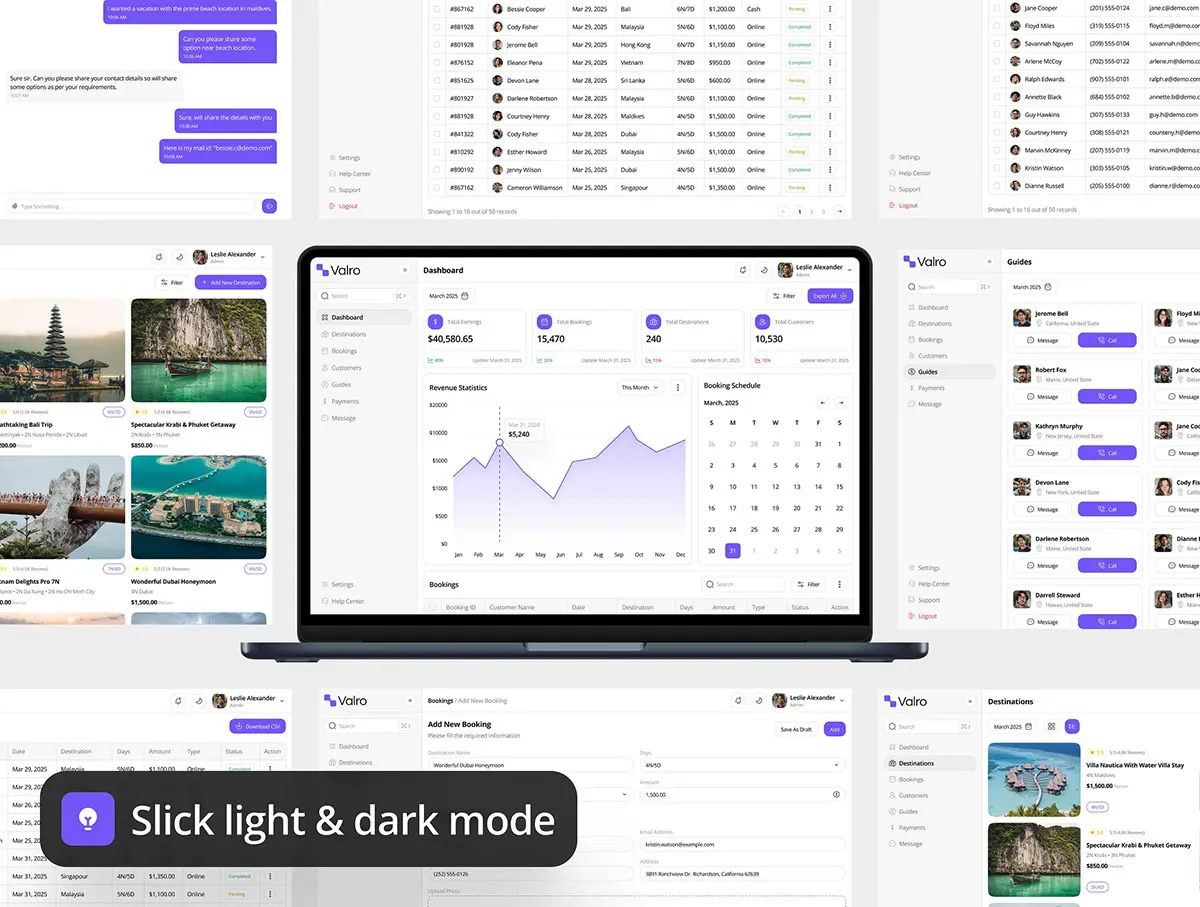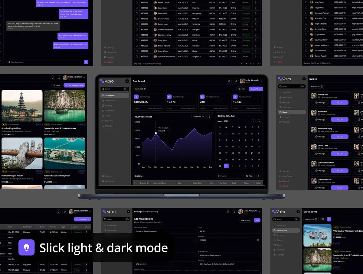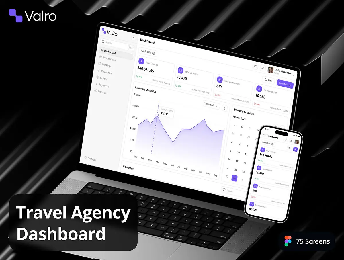 旅行社客户行程安排酒店预订后台数据统计订单管理ui界面设计模板 Valro – Travel Agency Dashboard Admin UI Kit
