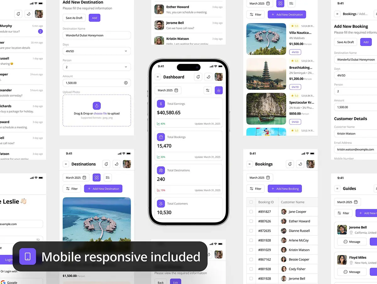 一个全面的 UI 套件,包含 75 个经过专业设计的屏幕,用于管理旅行预订、用户、分析等。包括明暗模式、完全响应式布局和移动友好型设计,确保在所有设备上获得无缝的用户体验。非常适合旅行社、旅行社和预订平台。💠