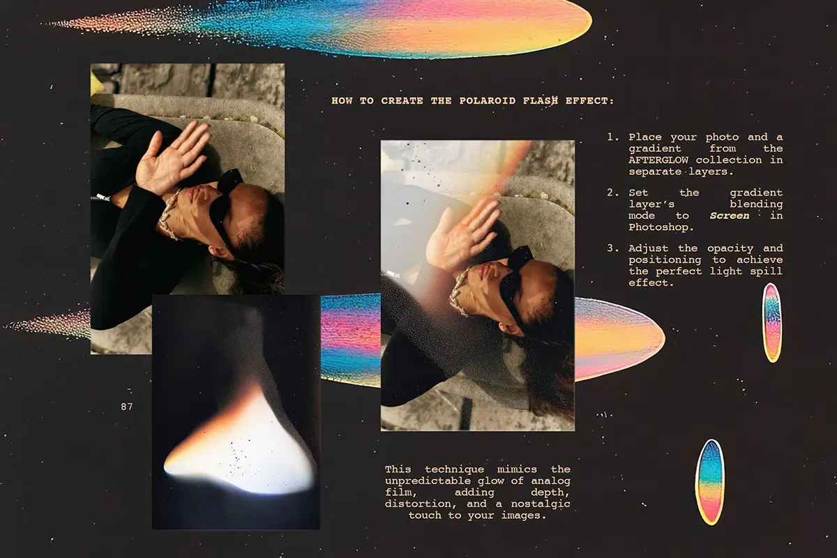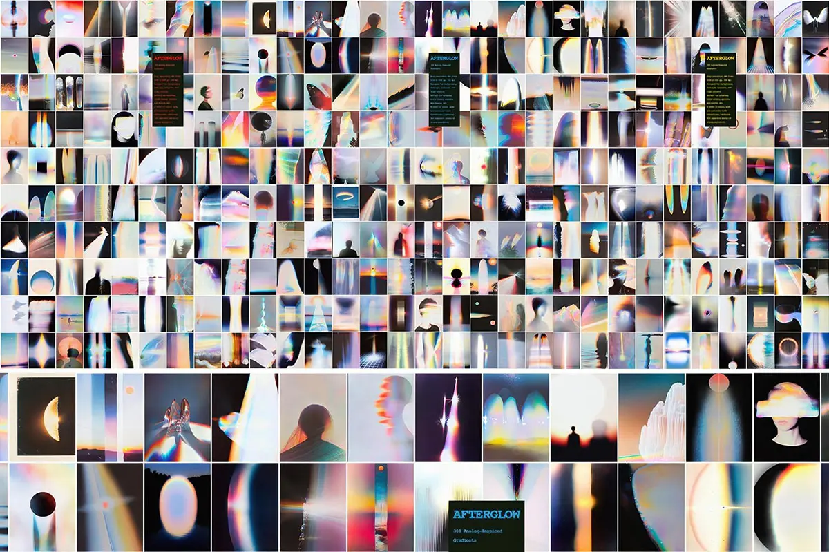 AFTERGLOW 是一系列渐变色,带有破碎宝丽来照片和模拟图像的厚重感。它颗粒感十足,闪闪发光,充满褪色的光线。这些纹理本身就充满怀旧气息——但当你将它们融入设计中时,它们会像最时尚的潮流一样闪耀。