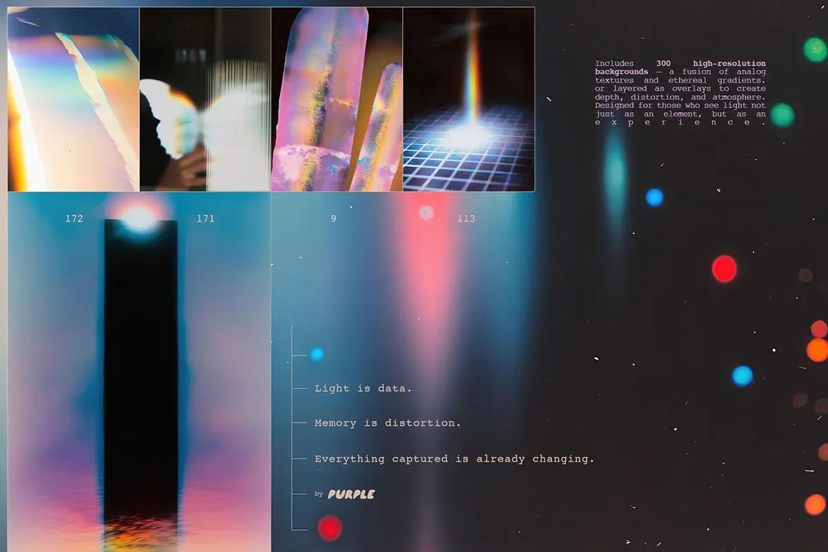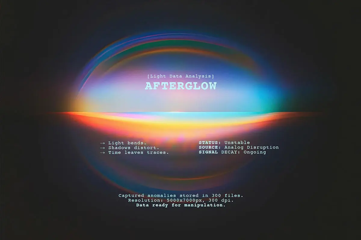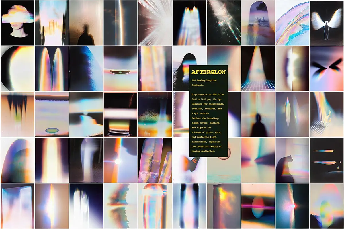 您将获得 300 张渐变 JPG, 它们看起来就像超新星的视觉残留物或被遗忘的广播信号的残留嗡嗡声。它们可以用作背景、叠加层、纹理或漏光,营造出一种梦幻般的氛围。该系列还非常适合品牌推广、专辑封面、社交媒体、海报和数字艺术。