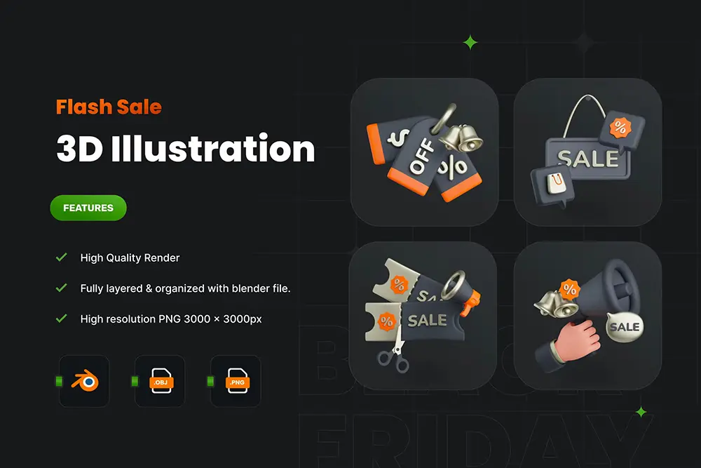 使用我们精心设计的闪购 3D 图标 03创建很棒的项目。使用这些图标,让您的登陆页面、应用程序、演示文稿和促销看起来更专业。