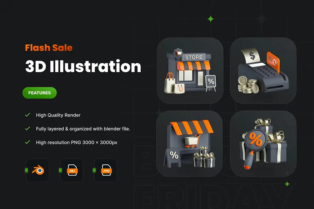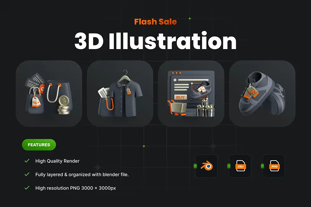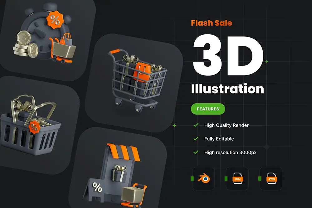 使用我们精心设计的闪购 3D 图标 03创建很棒的项目。使用这些图标,让您的登陆页面、应用程序、演示文稿和促销看起来更专业。
