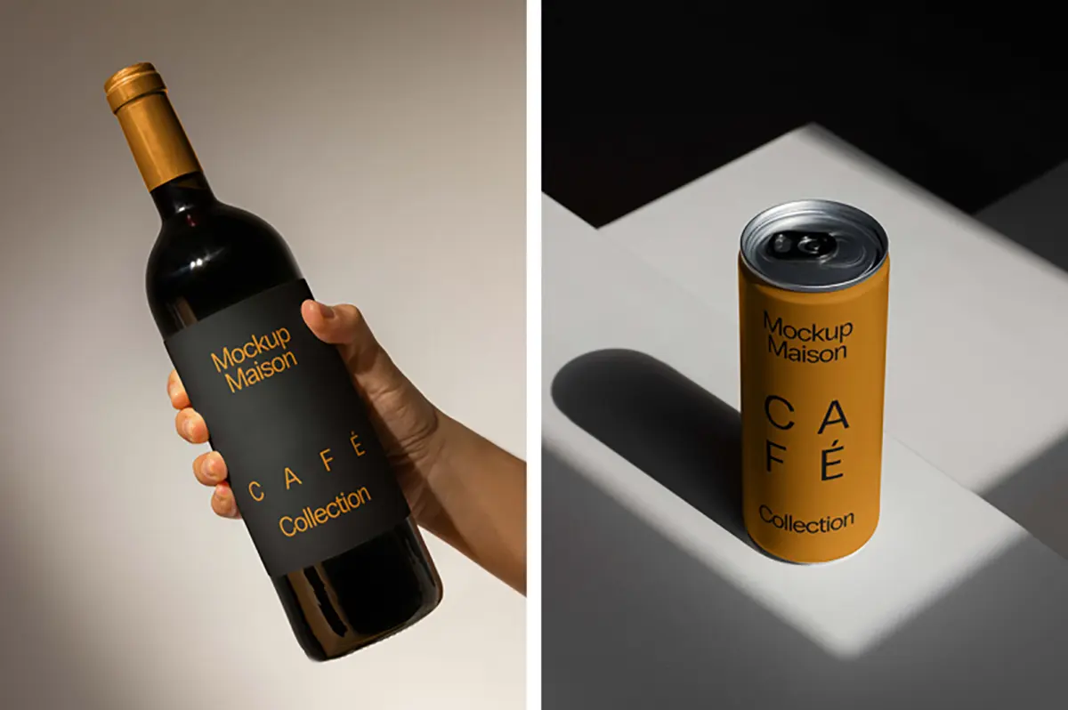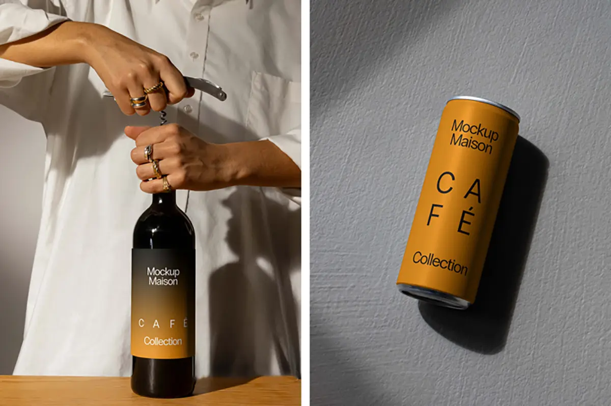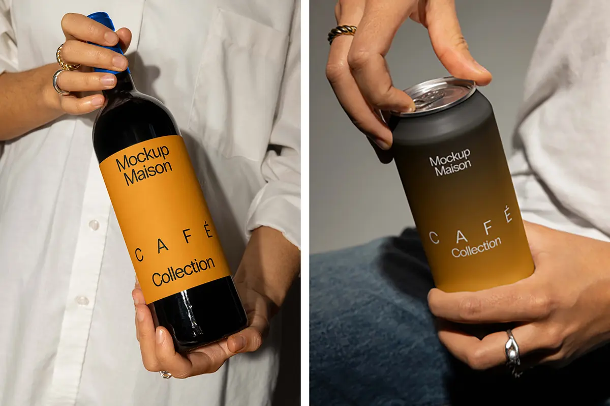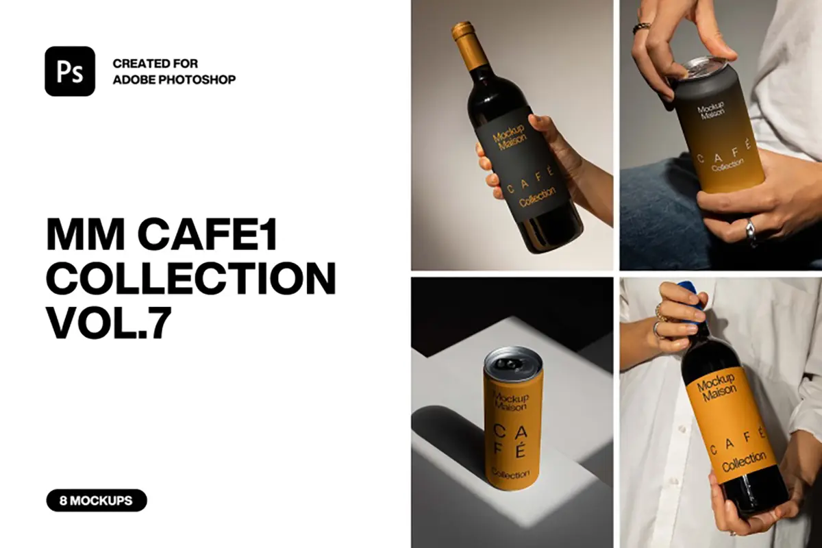 8款手持红酒瓶易拉罐饮料产品包装设计作品展示效果图ps样机素材 MM Cafe1 Collection VOL.7