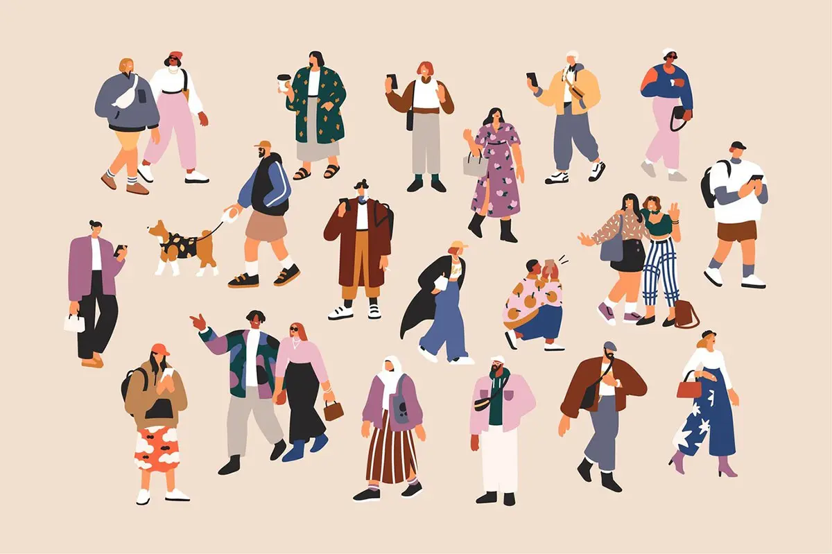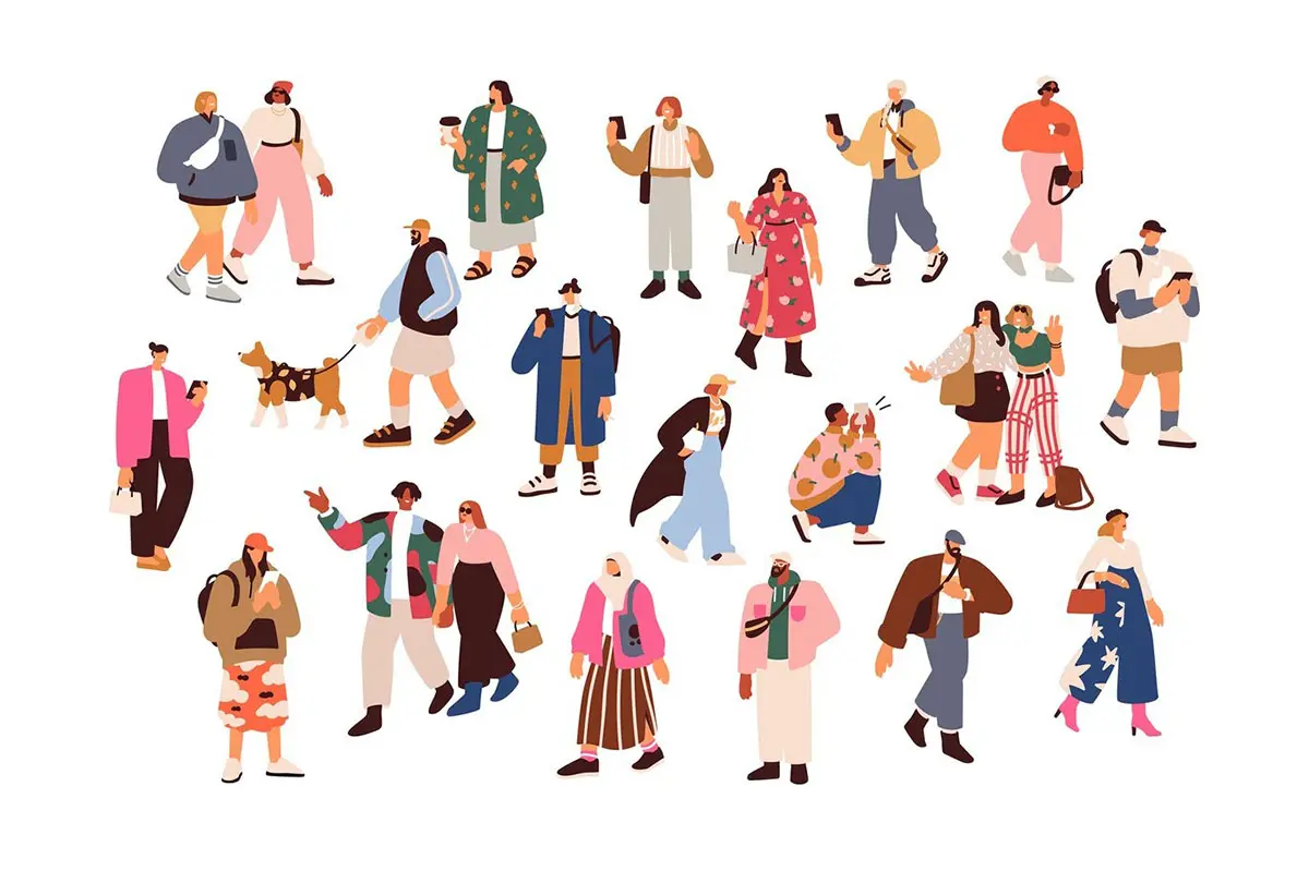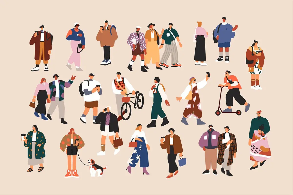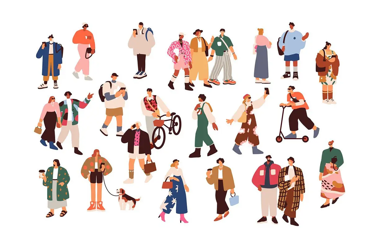 户外时尚休闲服饰扁平人物改色插图插画Ai矢量设计素材 Tiny People Crowd in Stylish Fashion Outfits Set