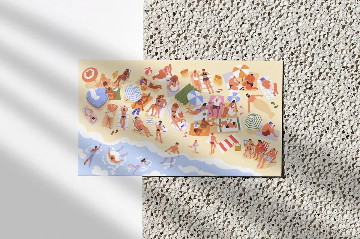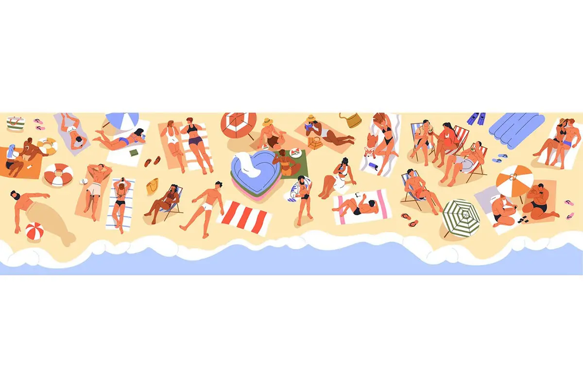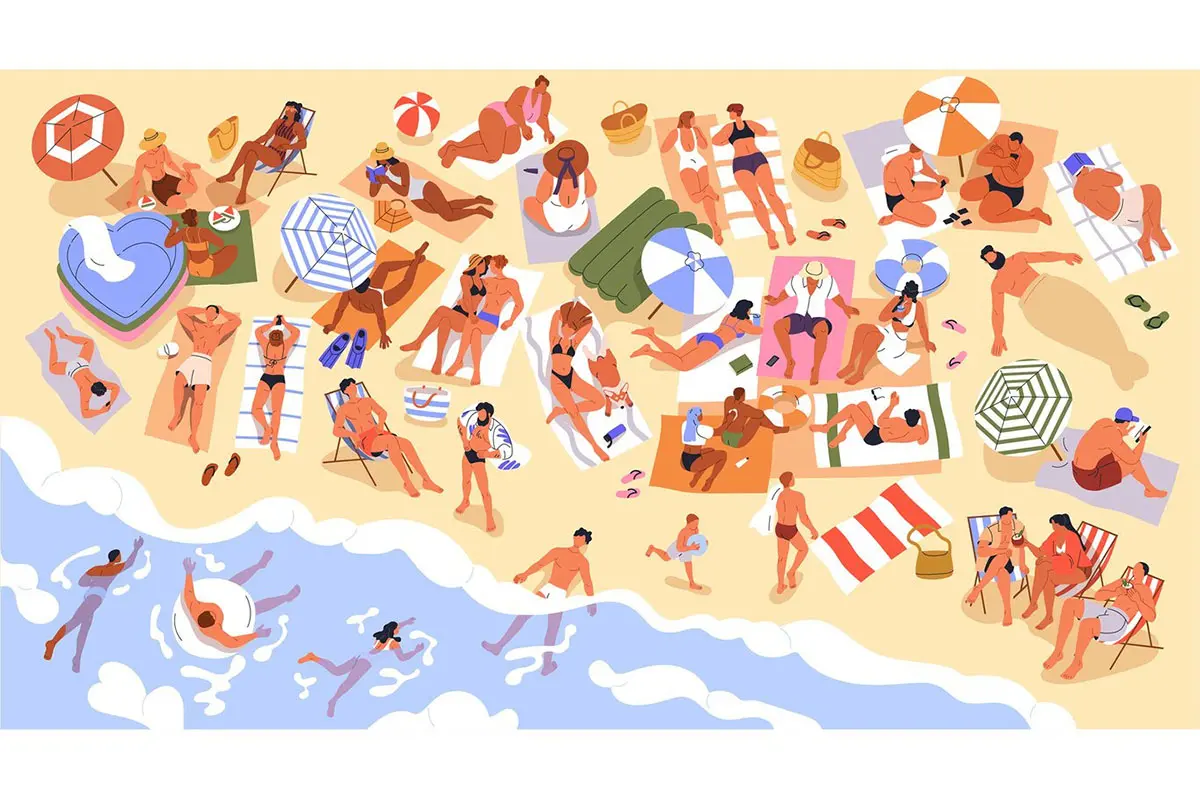 夏季海滩上休闲日光浴水中游泳扁平人物插图插画Ai矢量设计素材 People Relaxing on Sea Beach in Summer