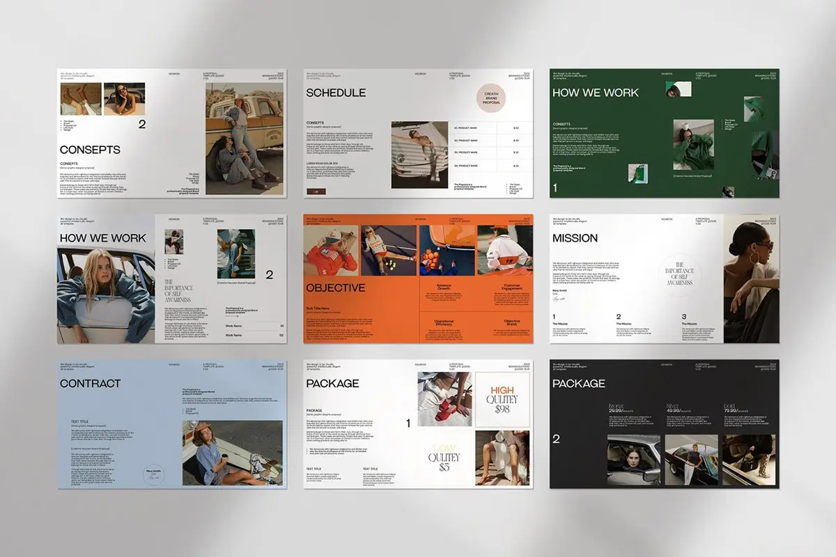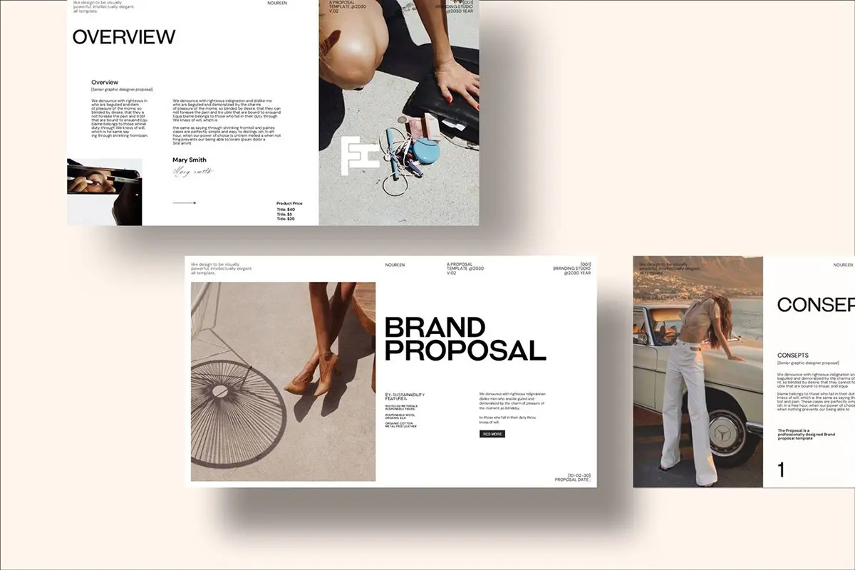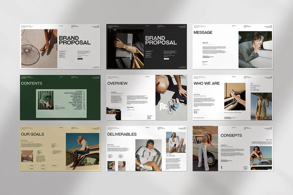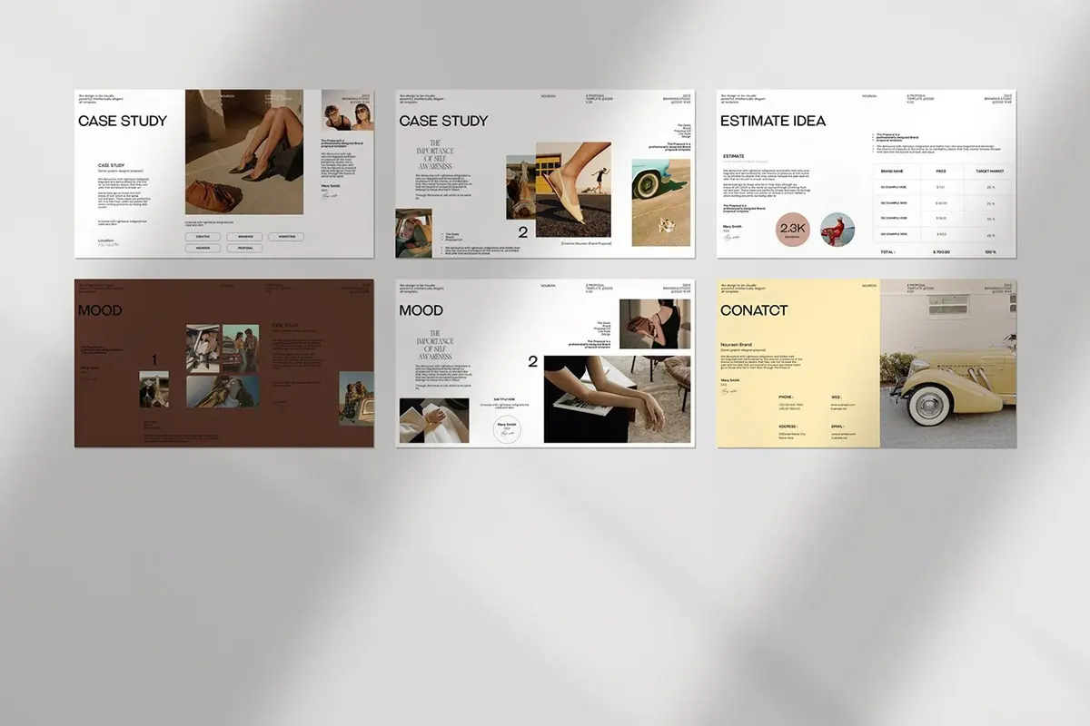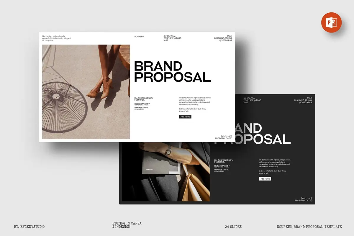 24页现代时尚简约品牌提案创意设计师简历汇报作品集ppt演示模板 Noureen Brand Proposal PowerPoint Template