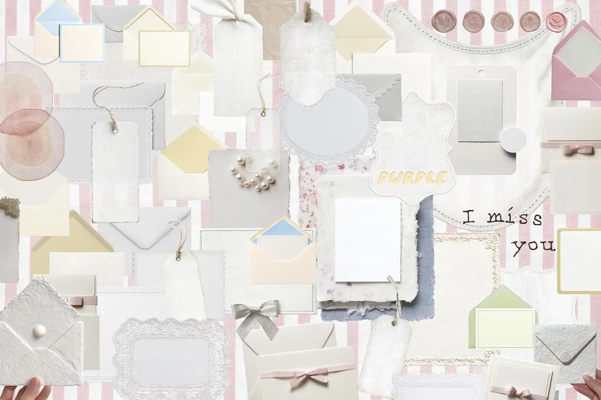 200+柔软情书拼贴艺术邮戳蝴蝶结贝壳信封手写数字字母符号PNG免扣图片 Laced Collage Collection