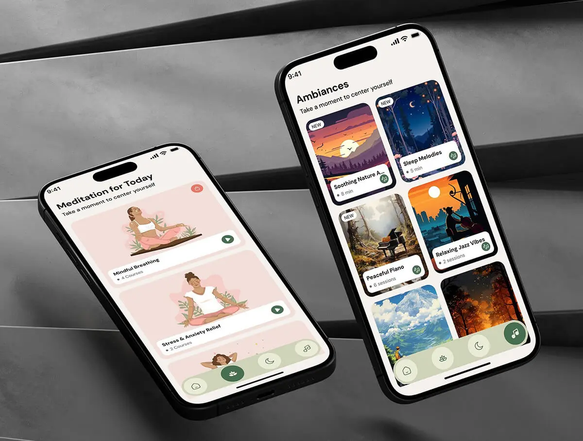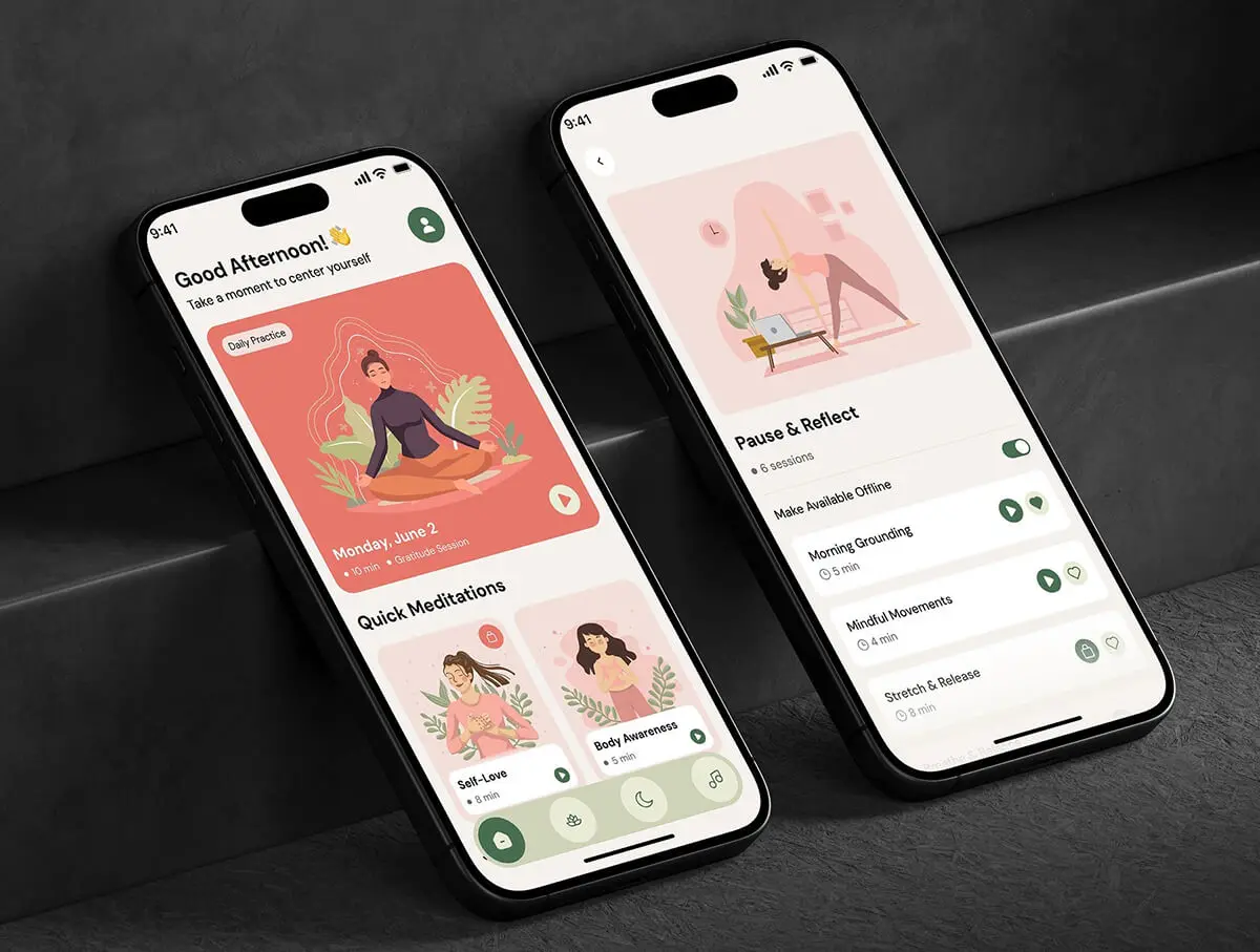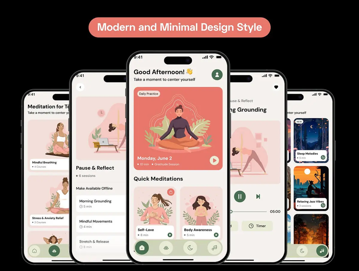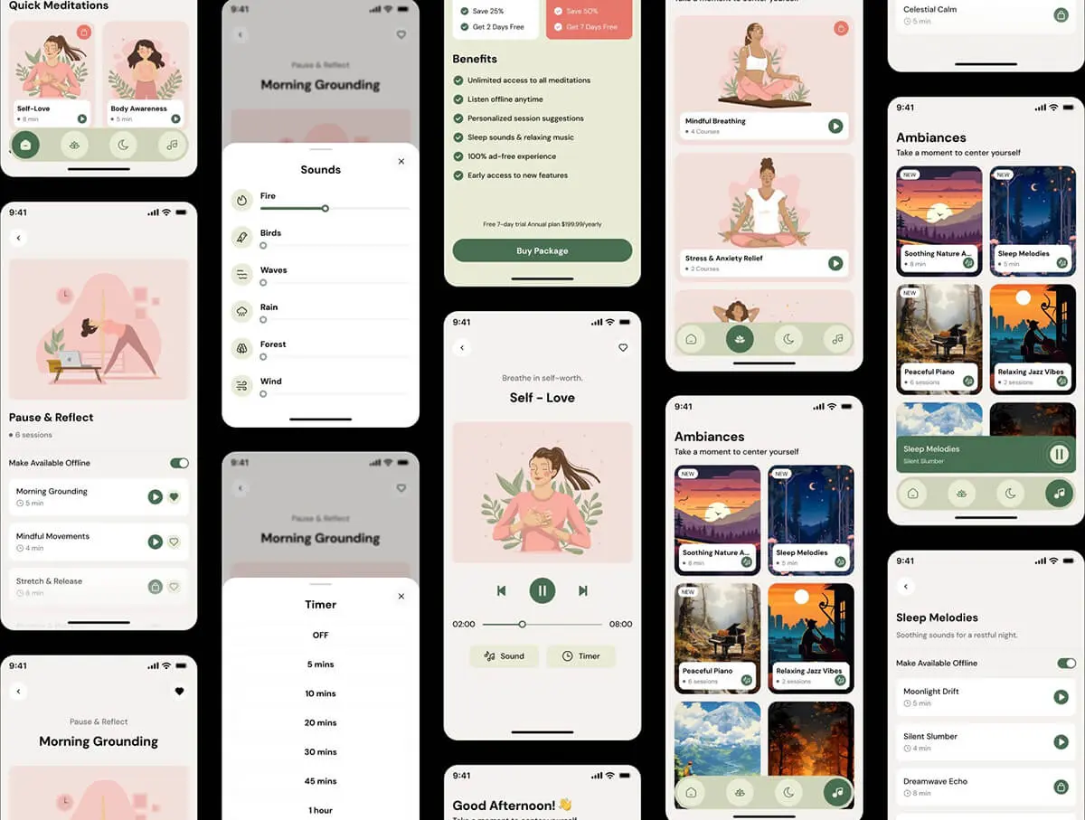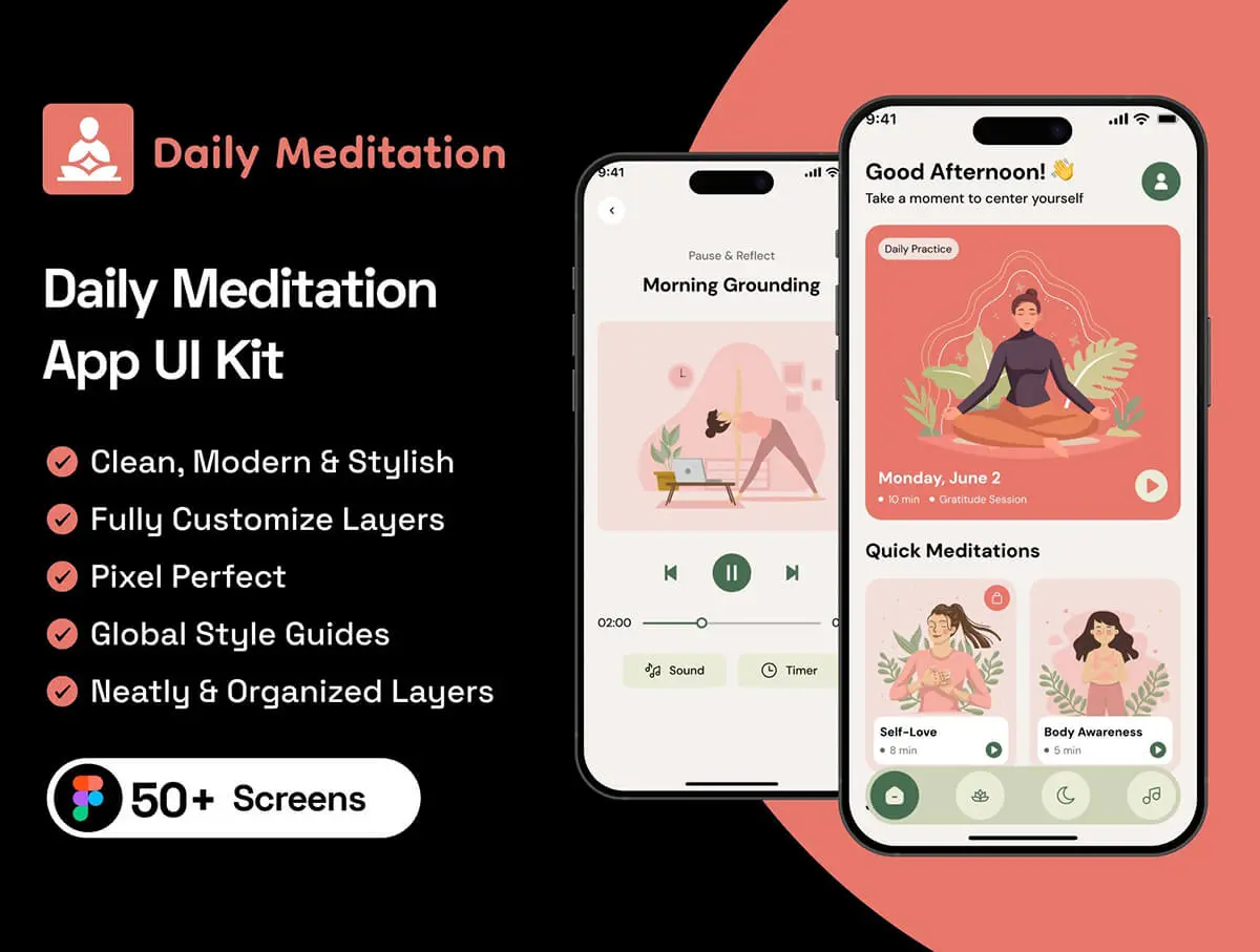 在线瑜伽课程冥想锻炼社交健康数据跟踪app设计组件明暗ui套件 Daily Meditation App UI Kit