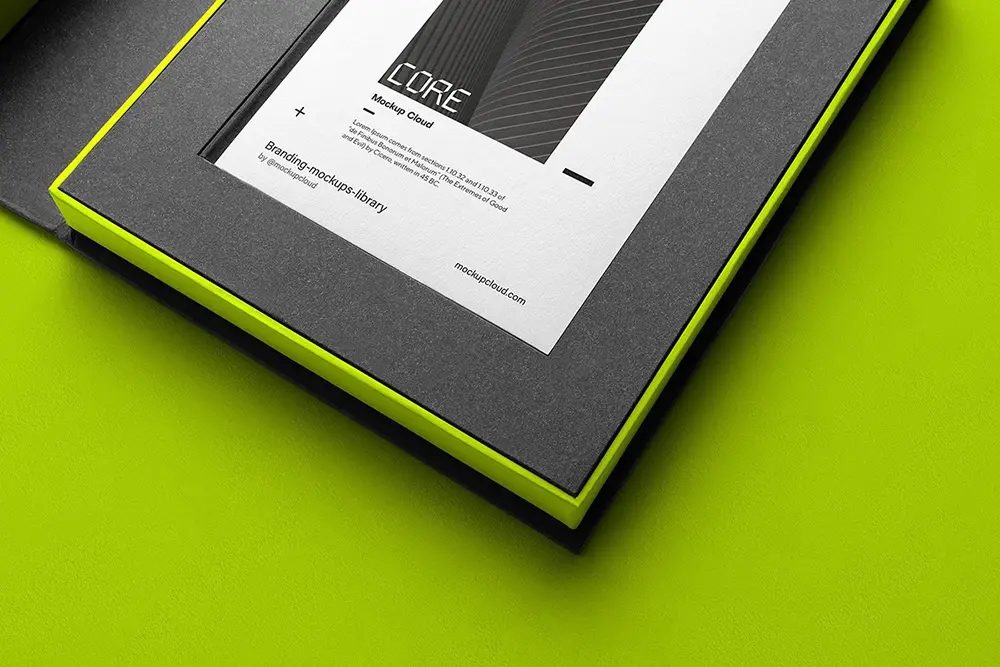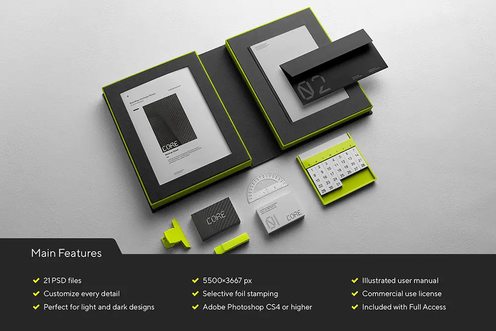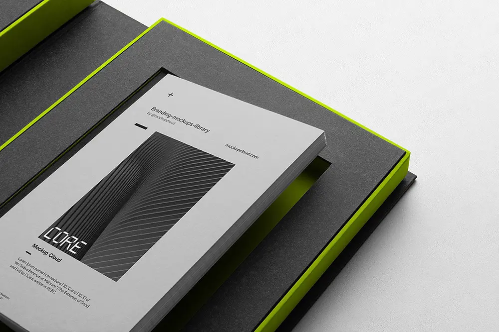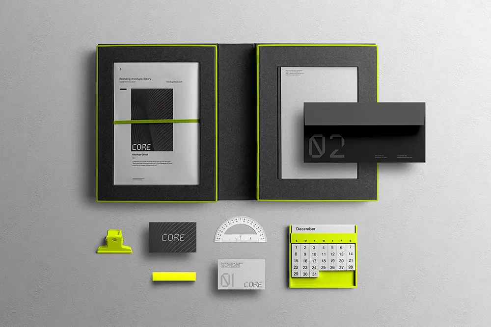 Core is a modern branding mockup kit with a sleek notebook packaging folder and various branding items – perfect for creating stylish branding presentations, website headers, Etsy, Instagram, Facebook, and Behance projects.