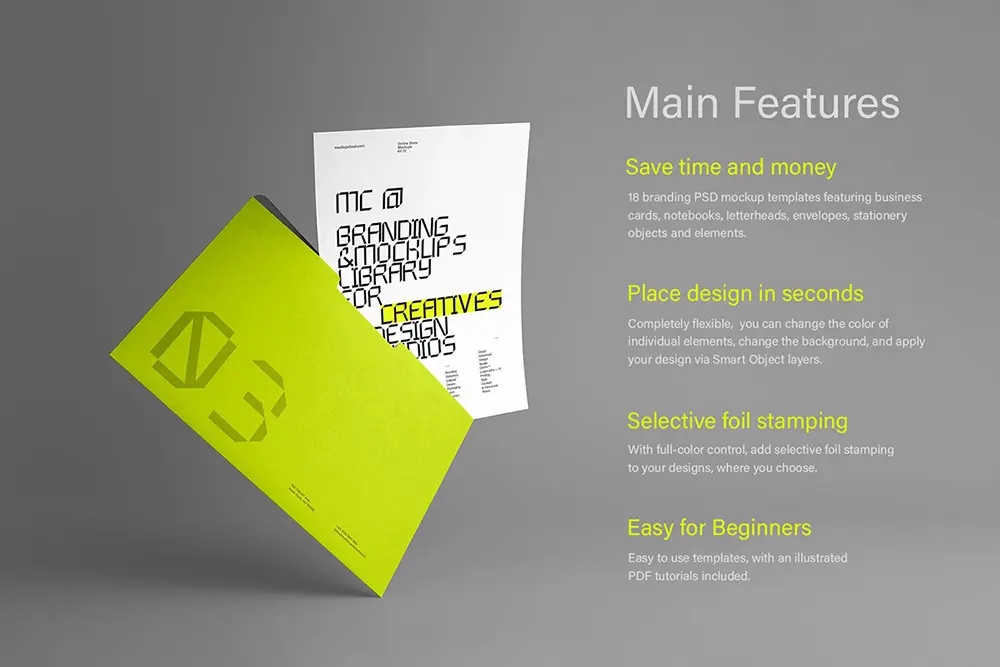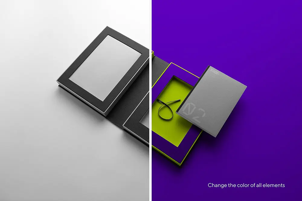 Customize every detail – you can change the colors of all items, add selective foil stamping and replace the background, the same mockup will work perfectly with dark and light designs, giving you full control over your scene. Please note, that every scene works as one, you can’t move individual elements.