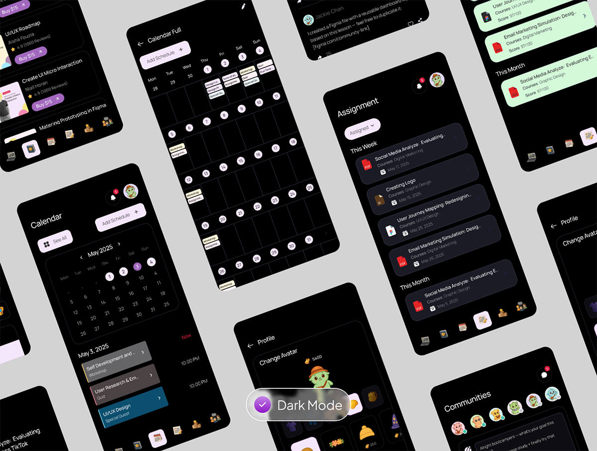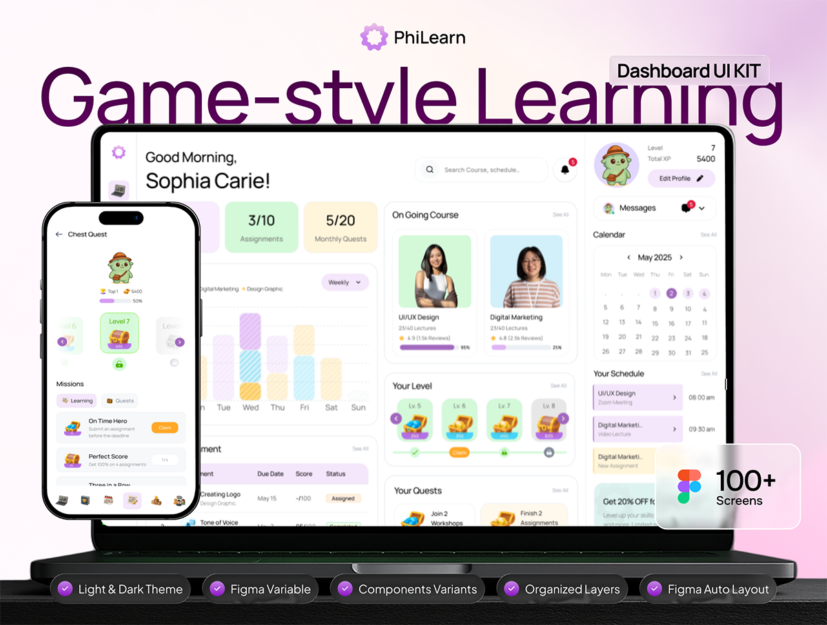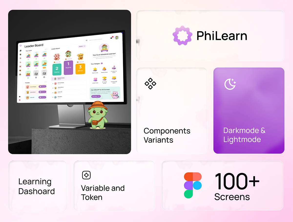 100+屏创意有趣游戏风格学习教育课程任务仪表盘UI界面设计Figma模板套件 PhiLearn – Gamified Learning Dashboard UI KIT