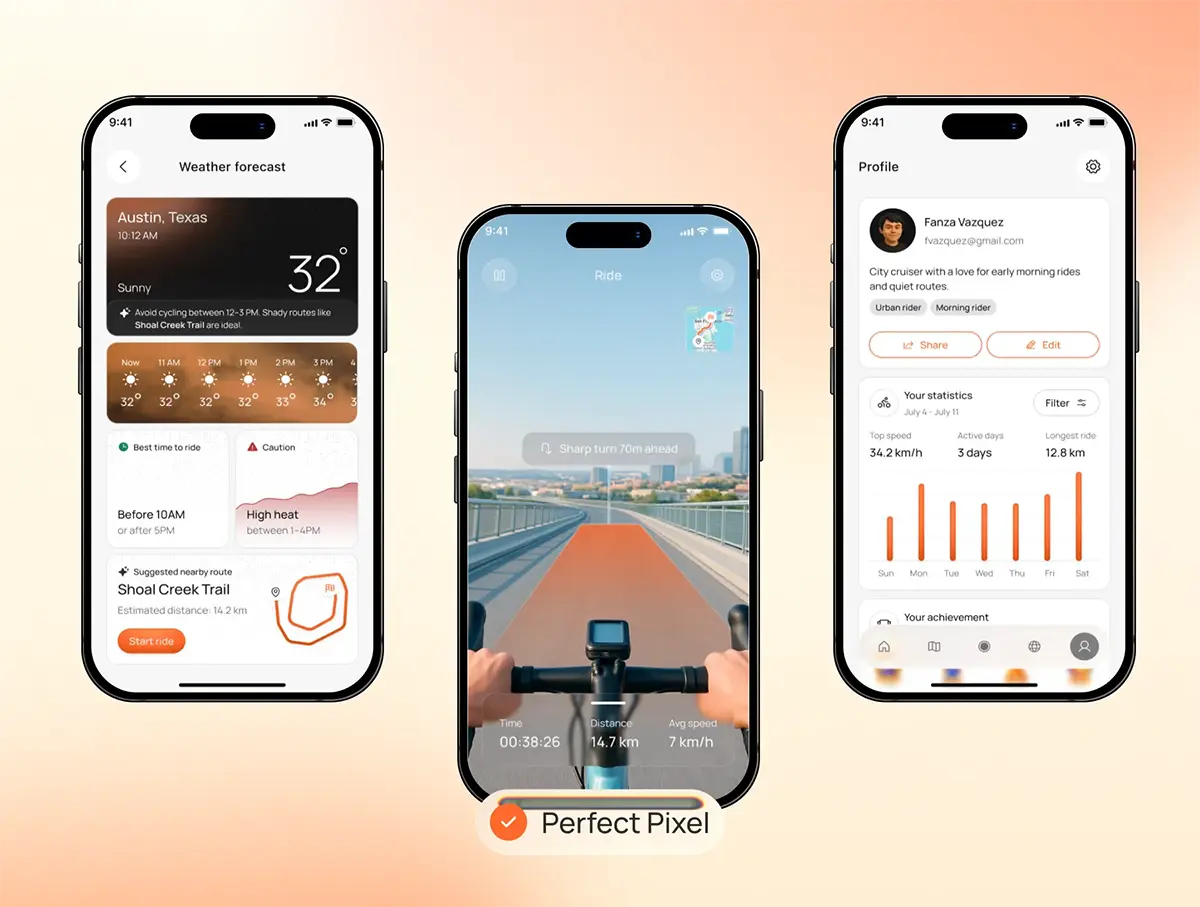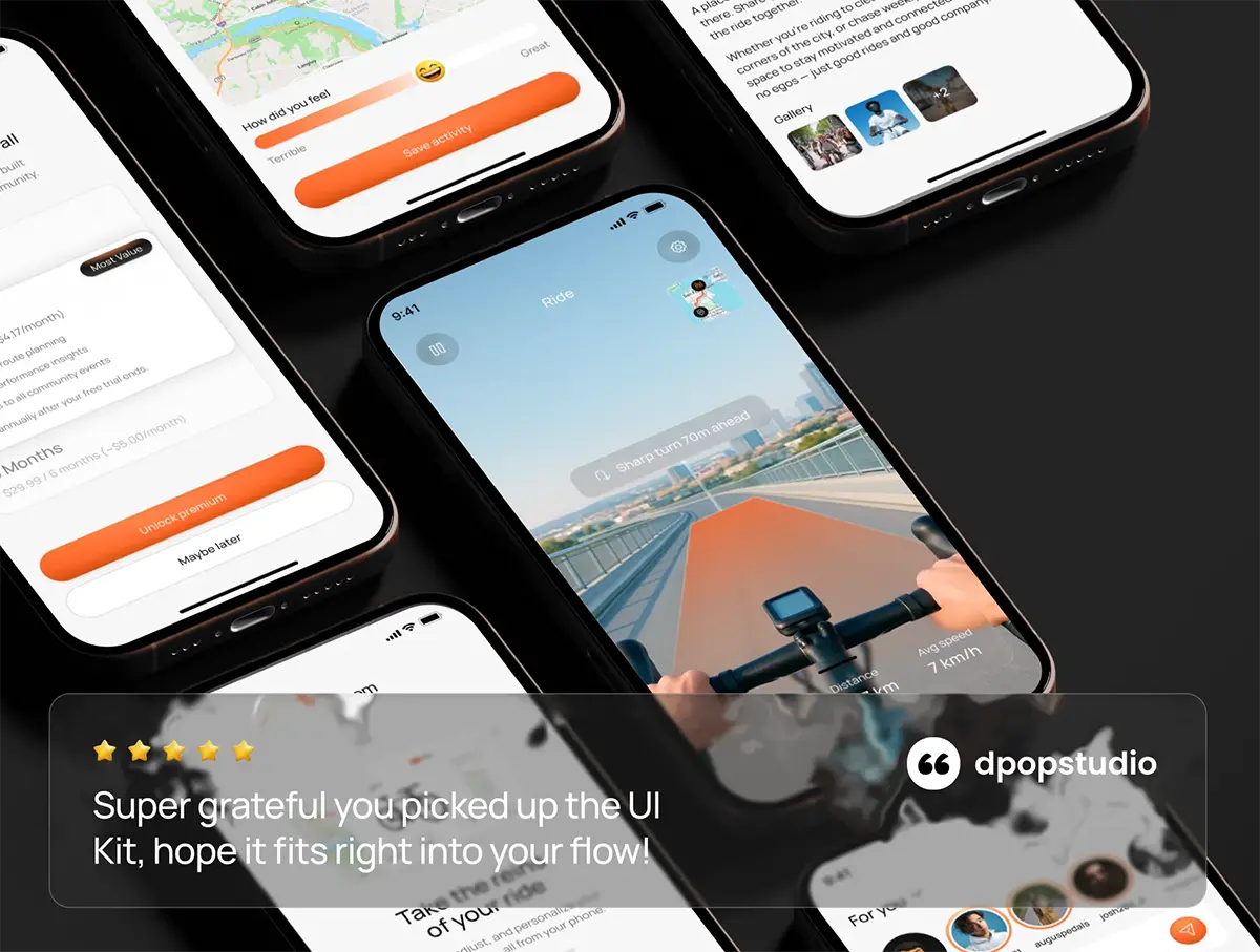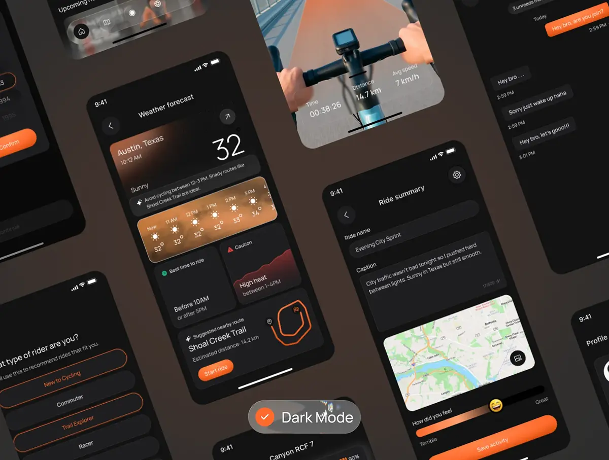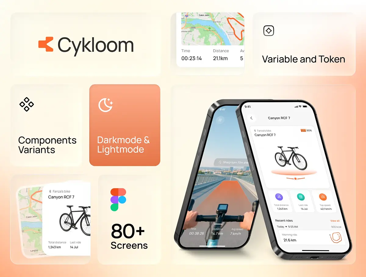80+屏自行车骑行轨迹跟踪骑行运动记录移动app界面UI设计 Cykloom – Modern Bicycle Mobile App UI KIT