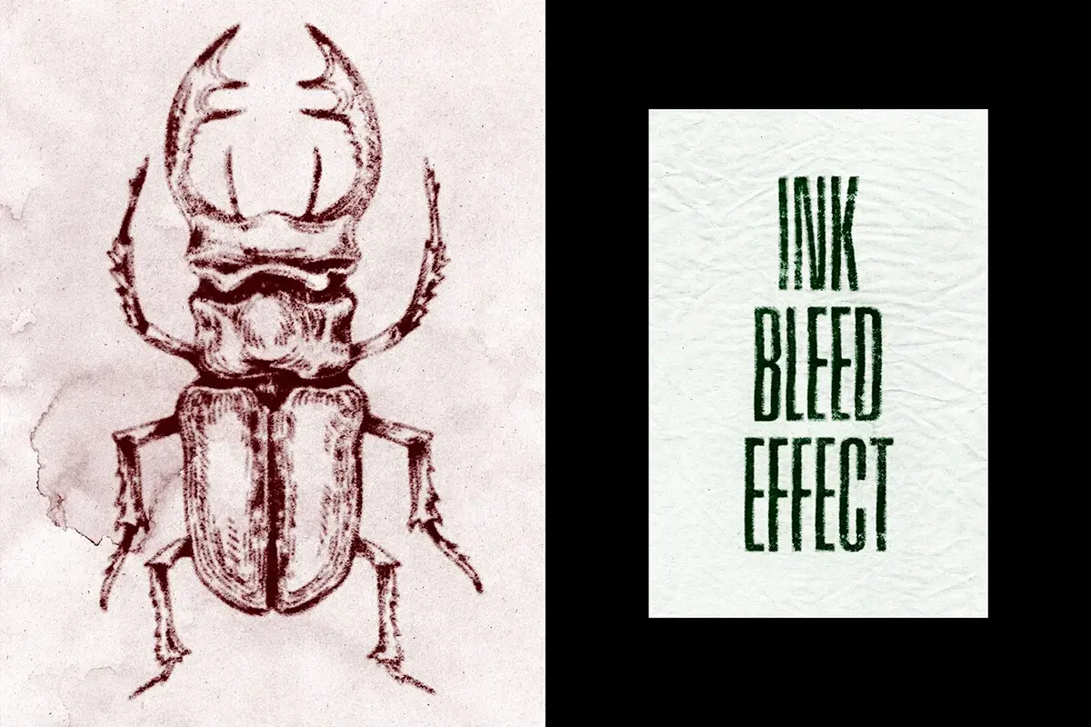 复古做旧粗糙水墨印章墨水喷墨印染渗色ps样机特效生成模板素材 Ink Bleeds Grunge Paper Effect