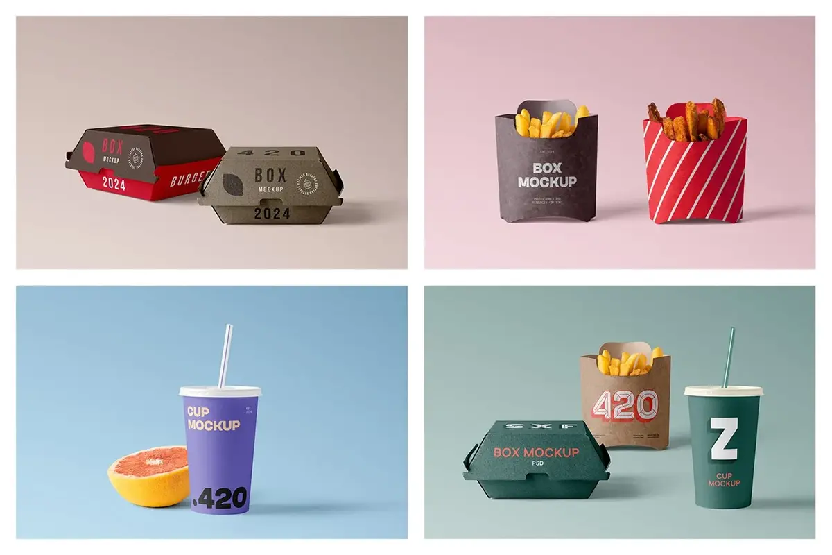 6款汉堡薯条外卖打包盒模型食品快餐品牌包装设计贴图ps样机素材模板 Food Packaging Mockups vol.2