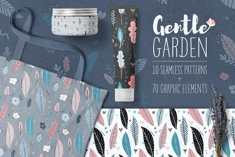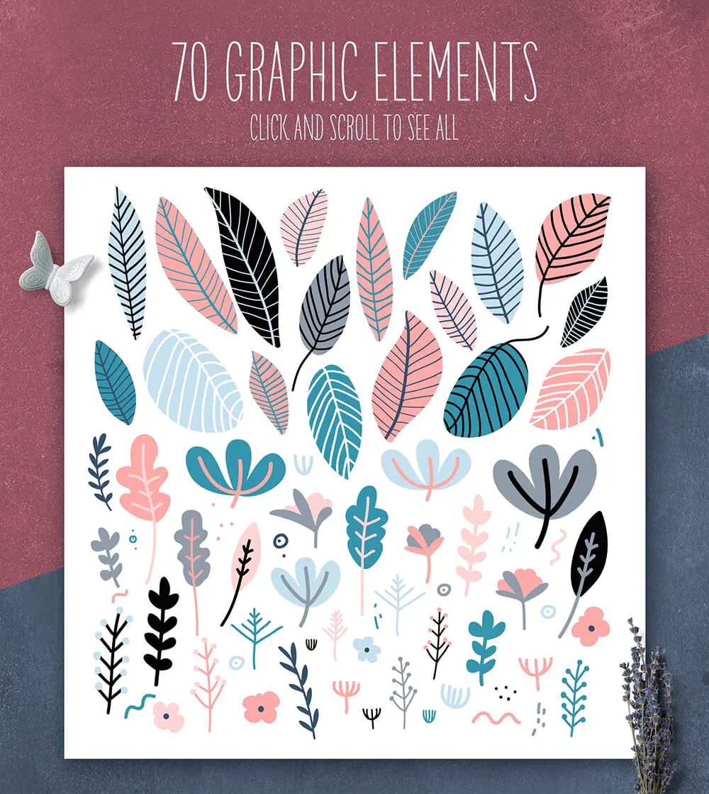 A wonderful romantic and gentle set with floral seamless pattern and elements of flowers and herbs + 70 graphic elements. Lovely natural patterns for wallpaper or fabric in pastel colors. Use them to design goods, sites, packaging or postcards and etc. Combine, play, show imagination!