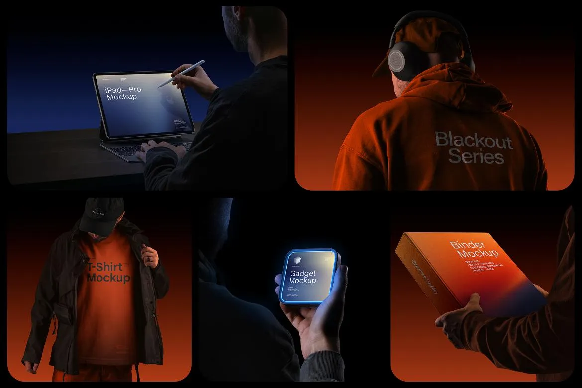 13款弱光科技数码文具服装产品包装VI设计作品展示效果图ps样机 Blackout Branding Mockups Kit