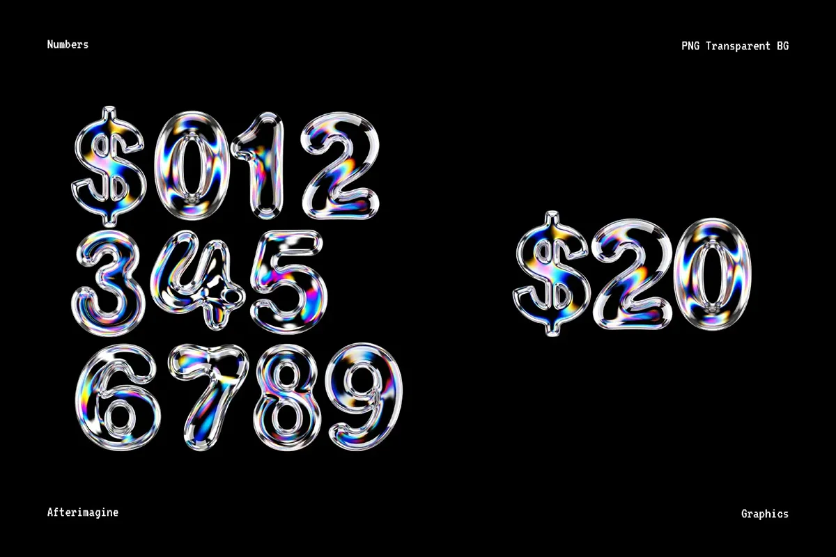 90款3D立体科幻虹彩液态玻璃几何图形字母数字png免抠图片素材 3D Glass Iridescent Shapes Pack