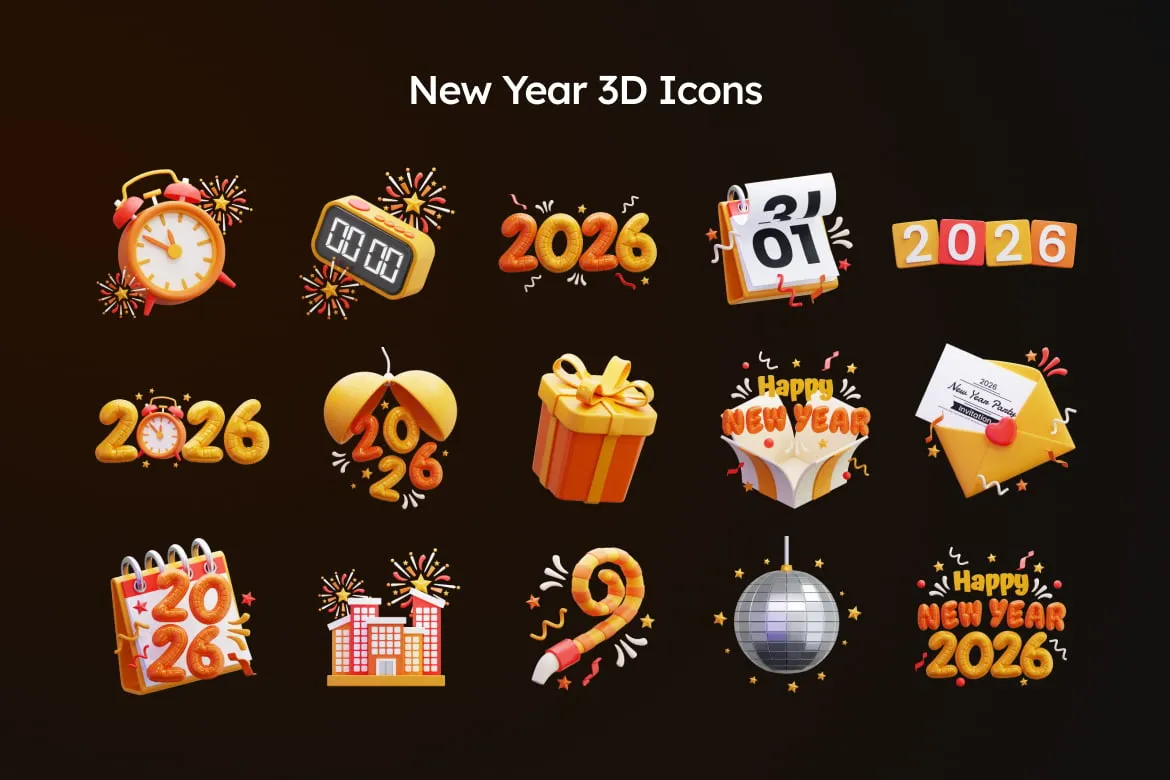 15个2026新年装饰3D图标png免抠图icon素材 New Year 3D Icons