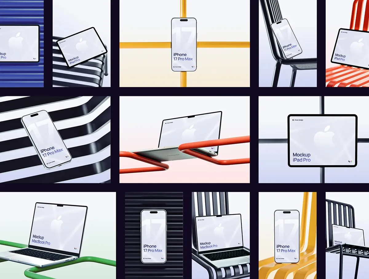 17款金属工业风iPhone17手机iPad平板Macbook笔记本电脑ps样机 Apple device mockup pack — 17 PSD and FIGMA scenes