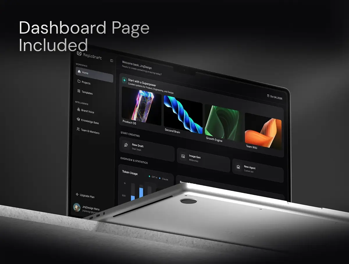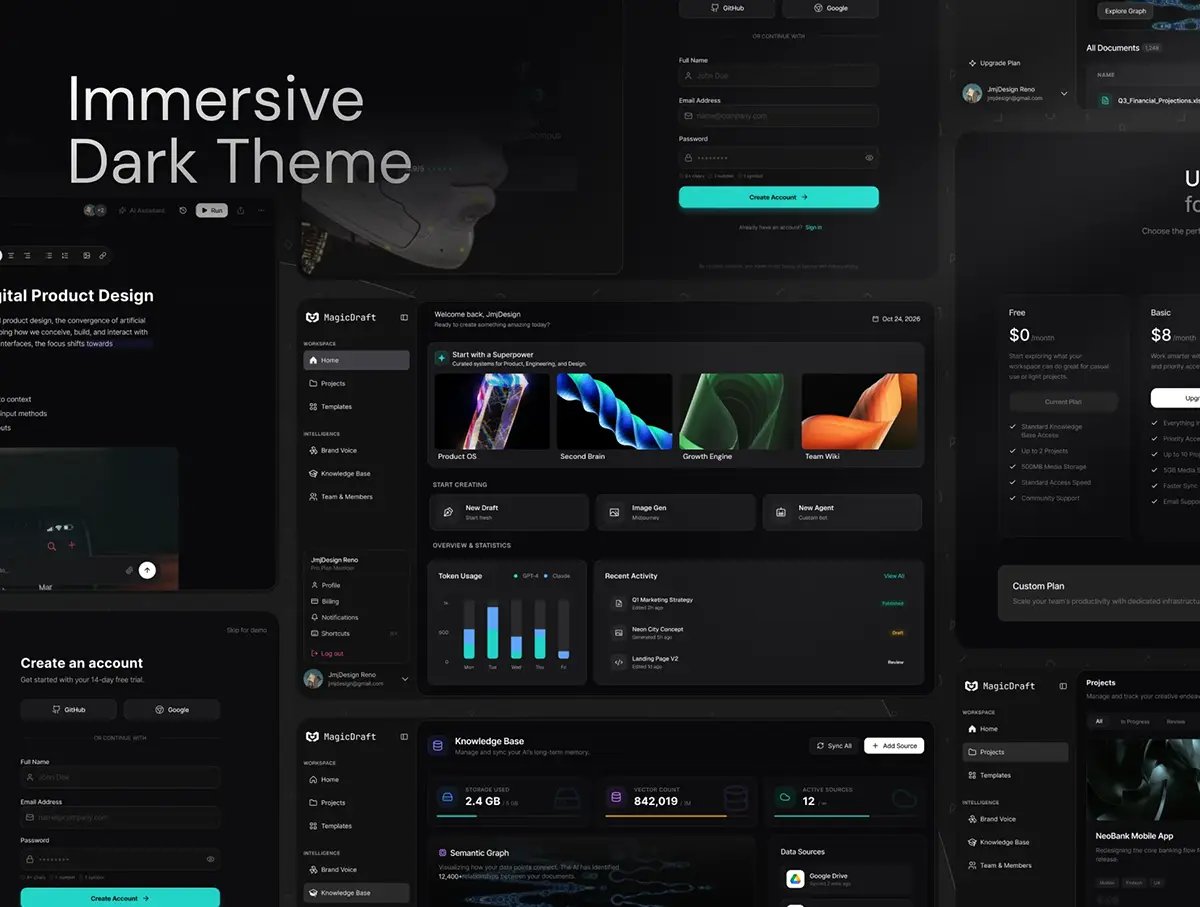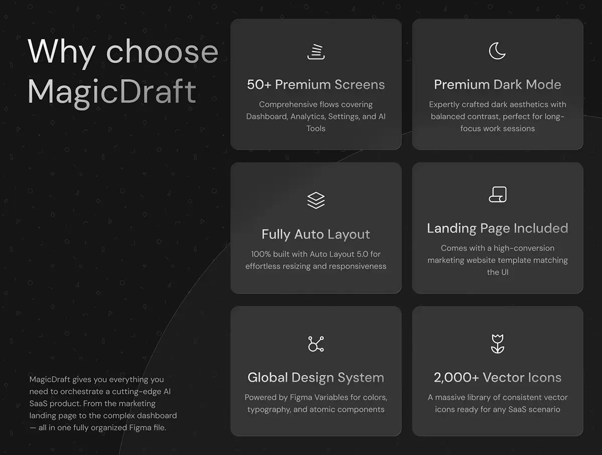 50屏SaaS后台系统AI工具数据管理可视化Figma网页端UI设计模板 MagicDraft – AI & SaaS Dashboard UI Kit (Dark Mode)