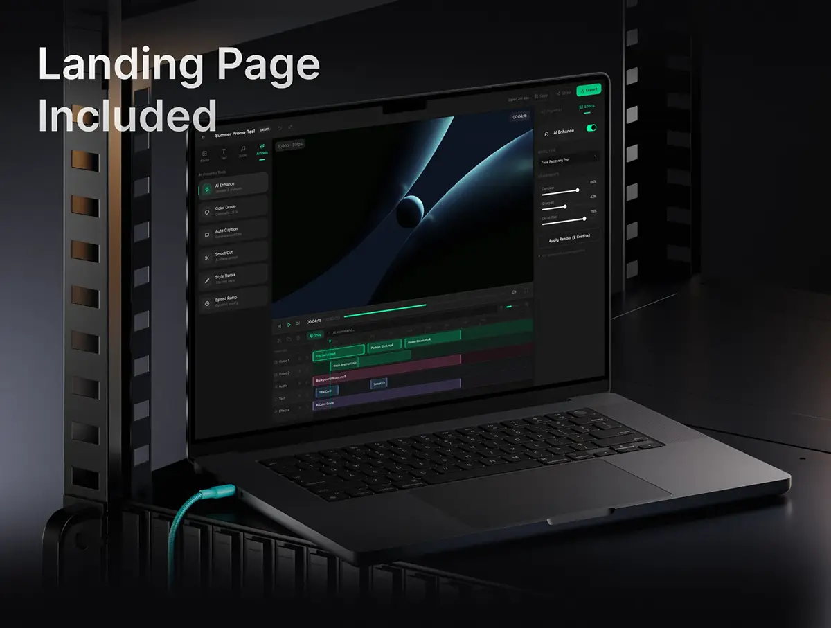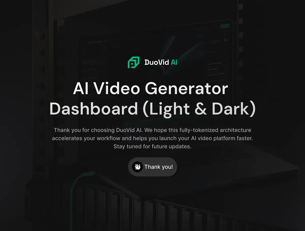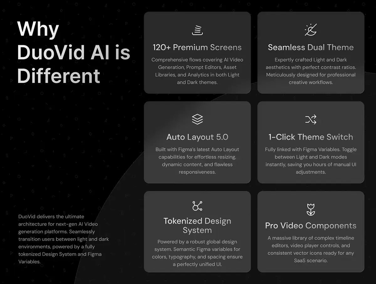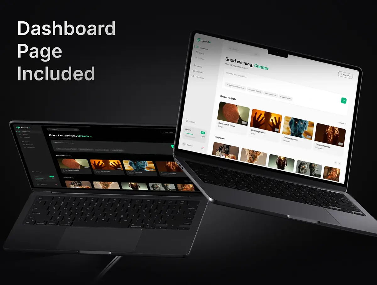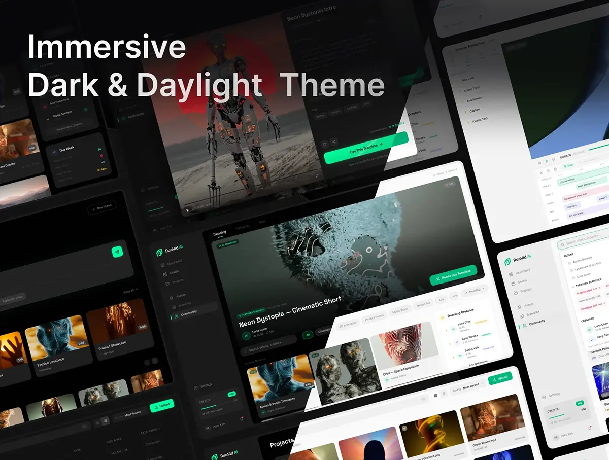 120屏双配色AI视频生成工具SaaS后台仪表盘UI界面设计组件库模板 DuoVid – AI Video Generator Dashboard (Light & Dark)