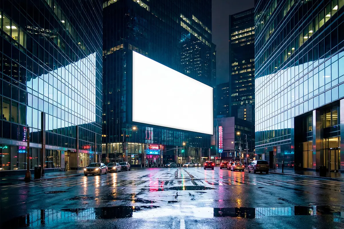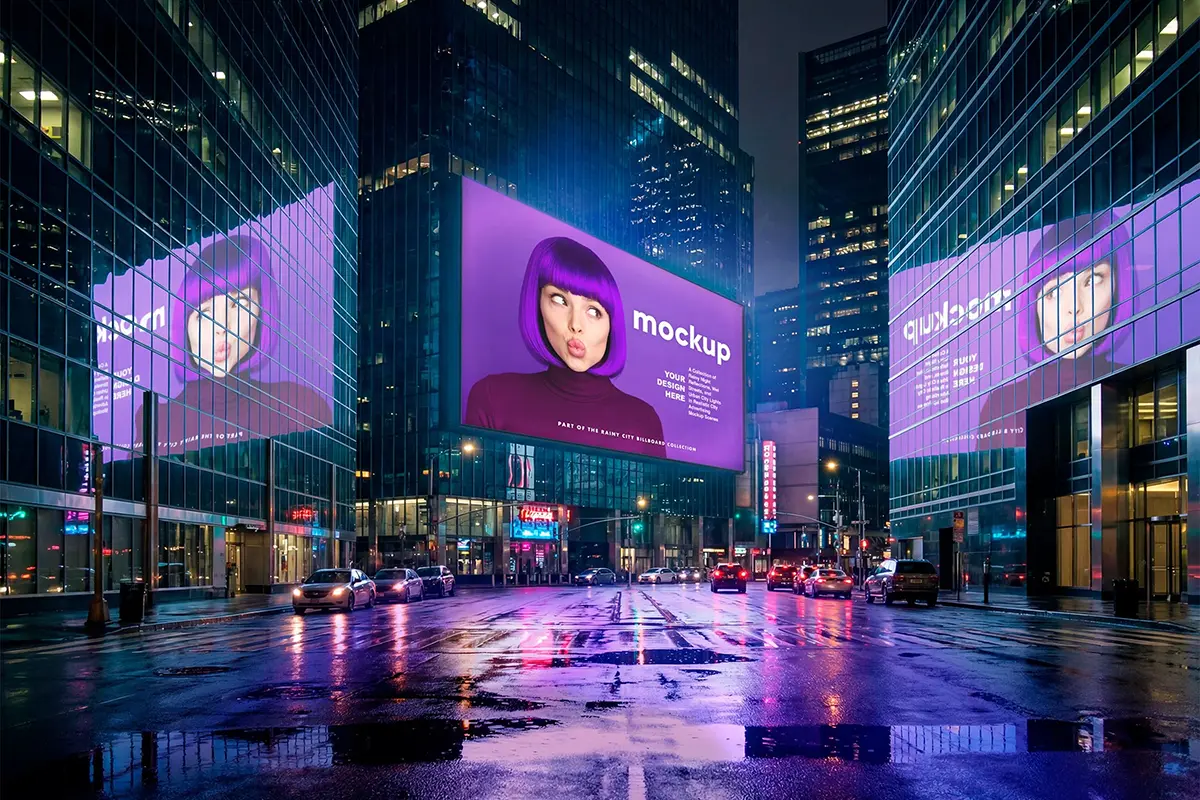 雨夜城市街道上水平广告牌的倒影模型图 Reflected Horizontal Billboard Mockup On Rainy Night City Street